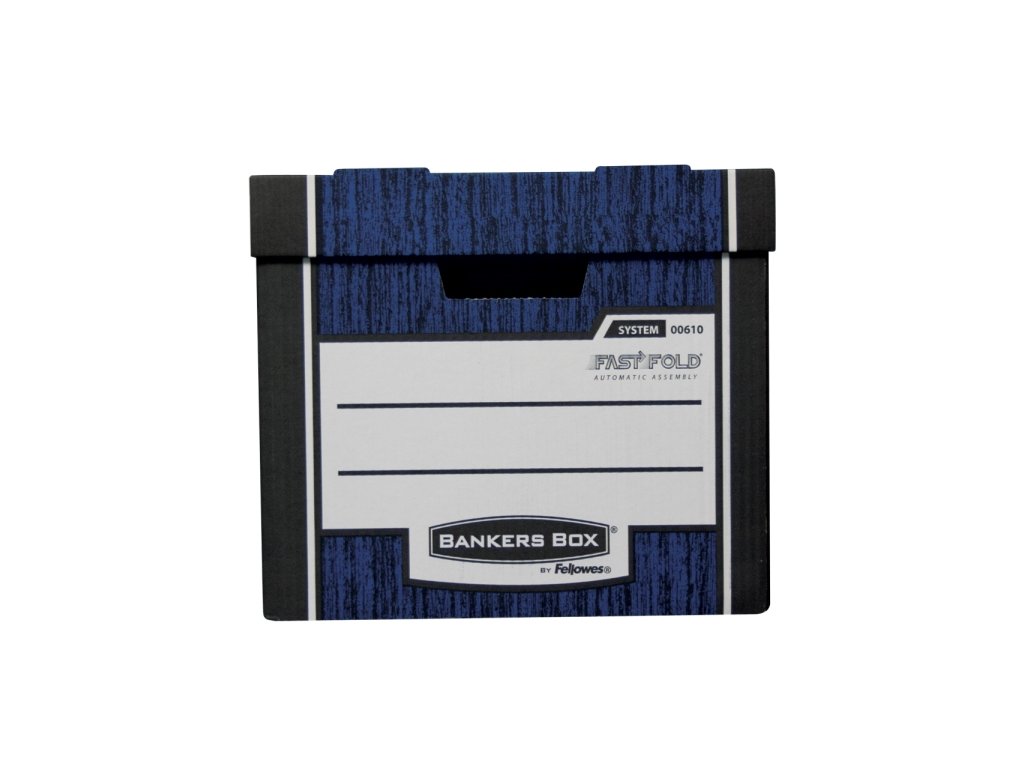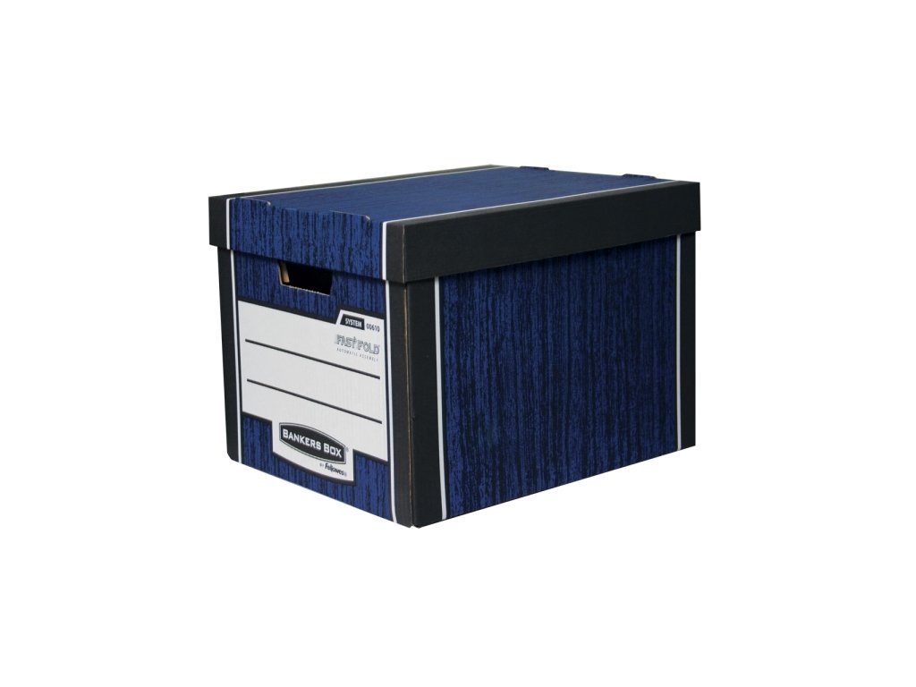 Série Bankers Box WOODGRAIN. Výhodou je snadné skládání - systém FastFold® umožňuje složení během několika vteřin. Vyrobena z tlusté vlnité lepenky s dvojitým systémem bočních stěn, otvory na bocích pro snadné přenášení. Velké etikety k popisu obsahu na čelní straně. Odklápěcí víko. Vnější rozměry (šxvxh): 340 x 295 x 405 mm, vnitřní rozměry (šxvxh): 325 x 285 x 385 mm. Barva modrá / imitace dřeva. Baleno po 2 ks. Dodáváme v rozloženém stavu.Doplňkové parametry