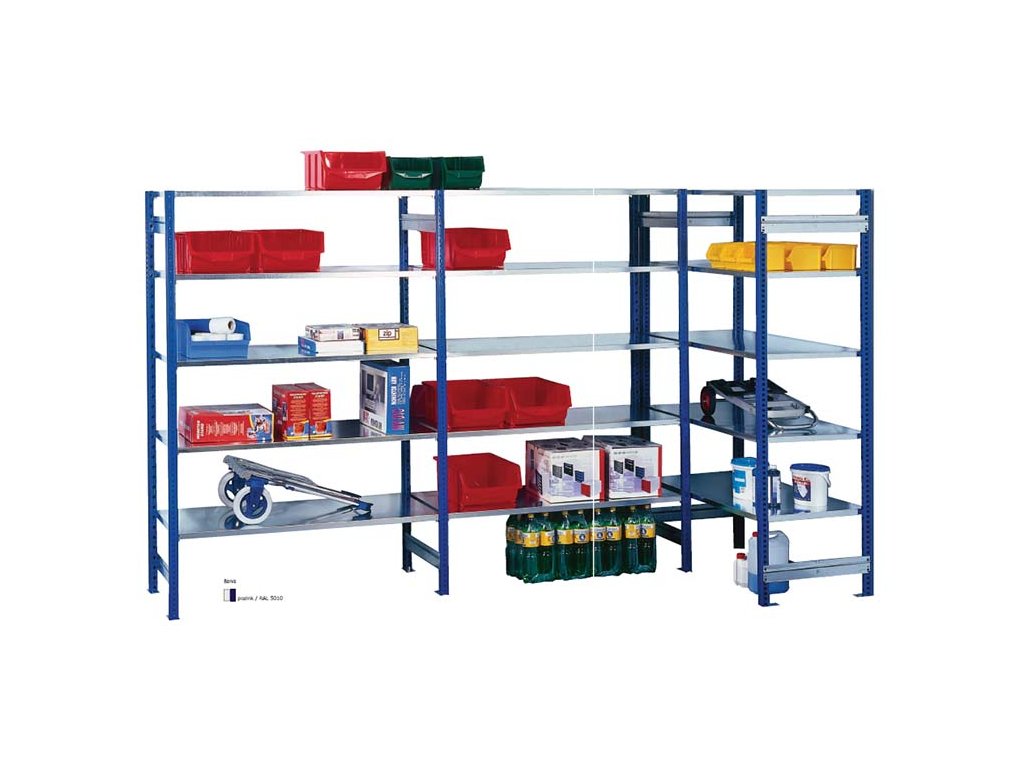 Přístavbové regály s odolnou stavebnicovou konstrukcí slouží pro ukládání objemného, volně loženého zboží v kartónech či přepravních obalech. Celokovové police z pozinkovaného plechu jsou stavitelné v rastru 25 mm. Regály jsou nabízeny v různých výškách 2 000, 2 500 a 3 000 mm (na vyžádání lze dodat i jiné rozměry až do výšky 6 000 mm). Výšku regálů lze měnit po 50 mm. Stavebnicové regály s povrchovou úpravou práškovým lakem jsou lehce smontovatelné bez použití nářadí a šroubů.