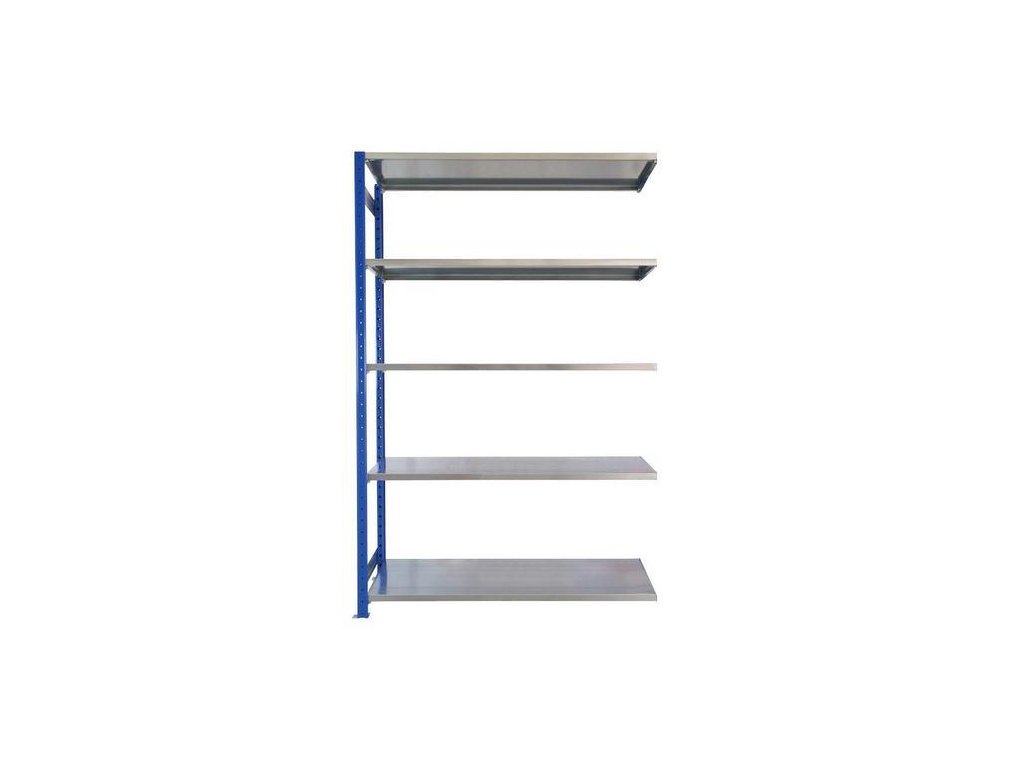 Kovový bezšroubový regál, přístavbový, 200 x 130 x 50 cm, 100 kg/police, 5 polic, modrý