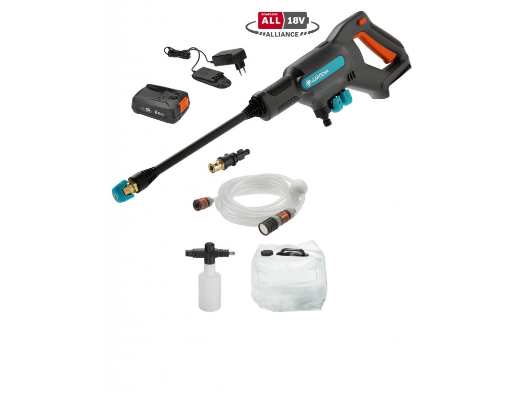 Čistič AquaClean 24/18V P4A Premium – sada připravená k okamžitému použití, je prvotřídní tlaková čisticí sada pro vás a všechny vášnivé majitele domů a zahrad. Zaměřen je především na neomezenou volnost; včetně balíčku příslušenství Premium. Sada Premium obsahuje účinný a výkonný středotlaký čistič s příslušenstvím a rovněž také pěnovou tryskou pro efektivní čištění povrchů a praktickou nádrž na vodu. Tento skládací vak s objemem 20 litrů pracuje v kombinaci s výkonným vyměnitelným akumulátorem (je součástí balení), aby umožnil mobilní použití bez kabelů a přípojky na vodu. Středotlaký čistič AquaClean lze používat prakticky kdekoliv díky tomu, že je obzvláště mobilní a adaptabilní. Jako jeden z nejuniverzálnějších tlakových čističů ve své třídě je vybaven integrovanou LED kontrolkou stavu nabití akumulátoru a 3 nastaveními výkonu zajišťujícími tlak 9, 14 a 24 barů. Ideální pro mnoho úkolů pro tlakové čističe. Pomocí nastaveného tlaku 24 bar lze důkladně vyčistit auta, jízdní kola a odpadkové koše. V případě potřeby lze tlak snížit na 14 barů nebo přepnout do režimu Soft-Clean. Tento režim Soft-Clean s tlakem 9 barů je obzvláště jemný a je určen pro citlivé materiály. Snížený tlak zároveň prodlužuje dobu chodu dobíjecího akumulátoru. V závislosti na provozním režimu je tlakový čistič schopen pracovat cca 38, 20 nebo 16 minut. Nový středotlaký čistič je poháněn novým 18V akumulátorovým systémem POWER FOR ALL. Aliance POWER FOR ALL je jednou z největších aliancí předních světových výrobců akumulátorů různých značek a nabízí nejrůznější možnosti použití kolem vašeho domu a na zahradě. Díky dlouhé výdrži akumulátoru můžete provádět důkladné a nepřerušované čištění. Dobíjecí akumulátor, který je součástí sady k okamžitému použití, lze kombinovat s dalšími kompatibilními zařízeními v rámci Aliance POWER FOR ALL. Akumulátor se rychle nabije na kapacitu 18 V a 2,5 Ah. Sada obsahuje tři různé nástavce trysek. Trysky se používají ke změně úhlu stříkání na 15° nebo 40°, každou trysku lze pro větší flexibilitu při čištění otočit o celých 360° vzhledem k tyči. Bodová tryska 0° je ideální pro výkonné čištění v malých zákoutích. Sada obsahuje 5 m dlouhou sací hadici s filtrem, plovákem a svorkou. Přívod vody lze připojit k tlakovému čističi prostřednictvím šroubení na kohoutek OGS. I presto, že není moderní čistič AquaClean připojen k elektrické síti, je tak silný, že díky funkci automatického sání s průtokem 250 litrů za hodinu, může čerpat vodu z hloubky až 2 m. Bez ohledu na to, zda chcete čistit auto, jízdní kolo, terasu, okenice domu nebo zahradní nábytek – inteligentní design, snadná manipulace a nízká hmotnost pouhých 1,5 kg bez akumulátoru zajišťuje pohodlnou práci po dlouhou dobu. Sada k okamžitému použití AquaClean 24/18V P4A Premium obsahuje krátkou, dlouhou a pěnovou trysku Premium. Pro důkladné čištění povrchů je ideální použít s mýdlem nebo jinými čisticími přípravky. Tento prvotřídní, mobilní a univerzální tlakový čistič značky GARDENA vám umožní čištění kolem domu a zahrady. Vášeň poháněná značkou GARDENA.
