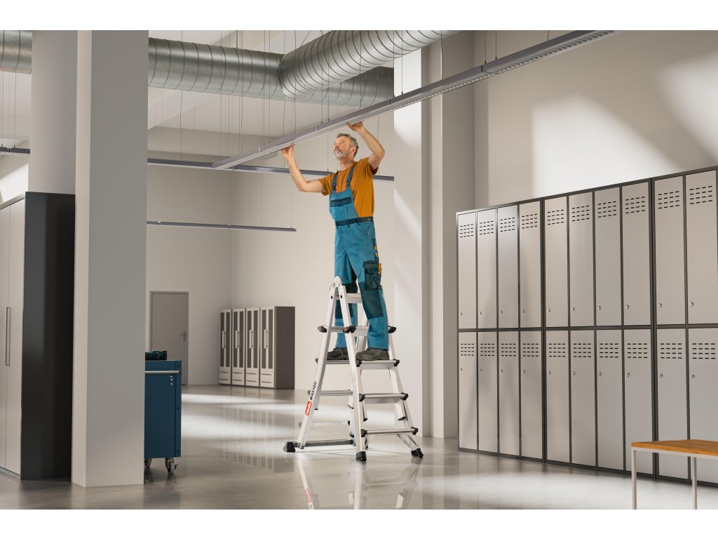 Hailo MASTER M100 je profesionální multifunkční hliníkový žebřík / štafle s teleskopickou funkcí. Díky robustní konstrukci a bezpečnostním kloubům umožňuje použití jako oboustranné štafle, příložný žebřík i práci na schodech. Široké nášlapy v pracovní části zajišťují ergonomický a bezpečný postoj i při delší práci.