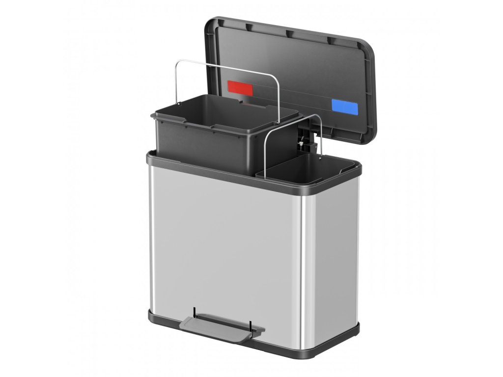 Precizní provedení spolu s promyšlenou funkčností Vám nadmíru usnadní každodenní třídění odpadu. Tělo koše z ušlechtilé (nerezové) oceli odolné proti korozi. Víko, široký ergonomický pedál i dno z vysoce odolného černého plastu. Dvě odolné vnitřní plastové nádoby s kovovým úchytem, o objemu 17 a 9 litrů. Barvy vnitřních nádob: zelená, hnědá. Vnitřní nášlapná mechanika. Tlumené zavírání víka s pomocí mechanismu Soft close.