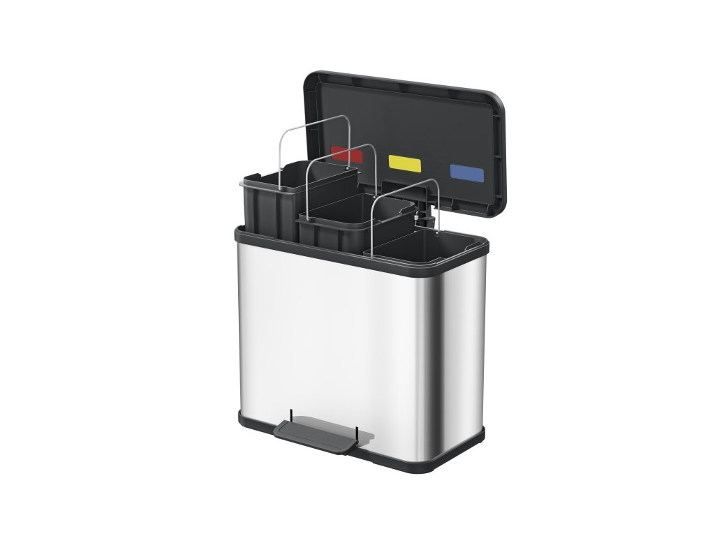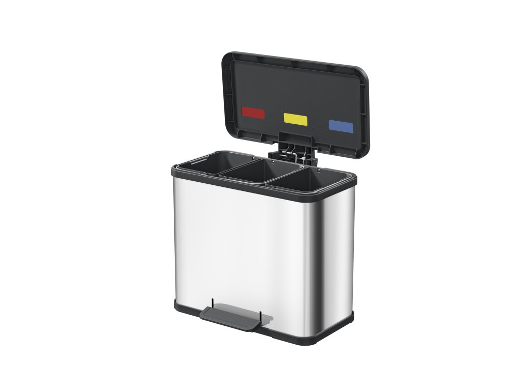 Precizní provedení spolu s promyšlenou funkčností Vám nadmíru usnadní každodenní třídění odpadu. Tělo koše z ušlechtilé (nerezové) oceli odolné proti korozi. Víko, široký ergonomický pedál i dno z vysoce odolného černého plastu. Tři odolné vnitřní plastové nádoby s kovovým úchytem, každá o objemu 9 litrů. Barvy vnitřních nádob: zelená, hnědá, žlutá. Vnitřní nášlapná mechanika. Tlumené zavírání víka s pomocí mechanismu Soft close.