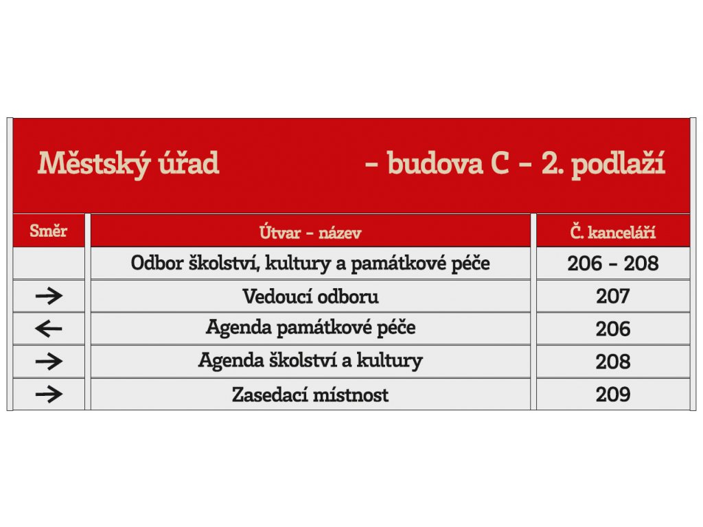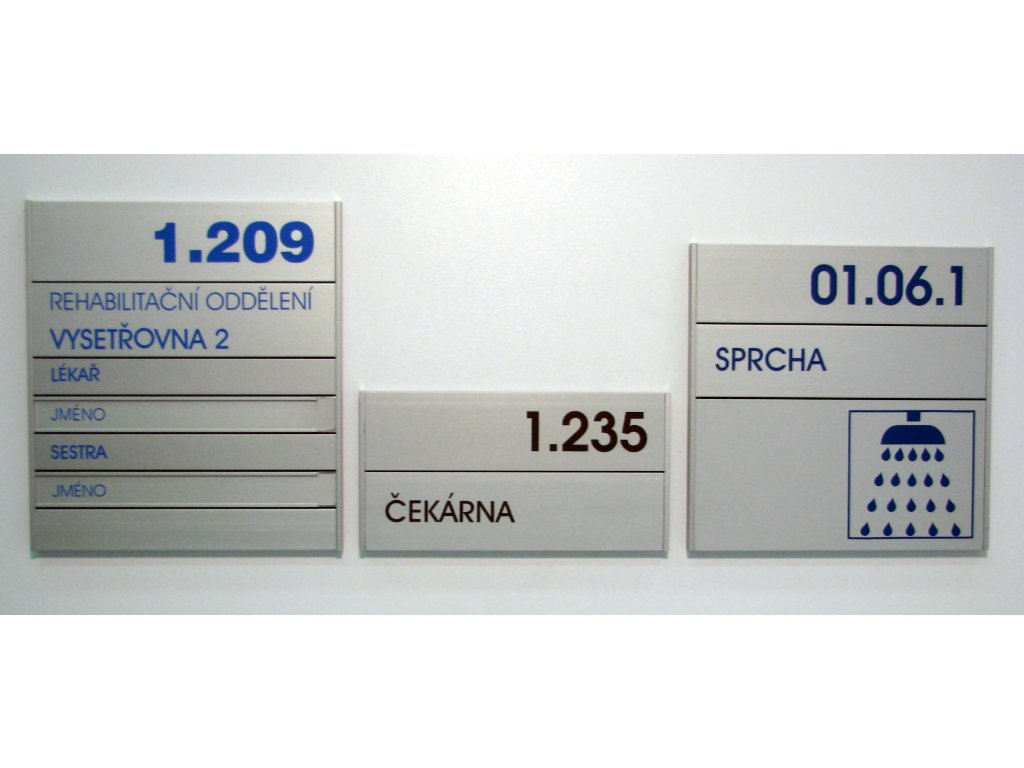 Informační cedule z hliníkového modulového systému SlimSlatz ve stříbrném eloxu. Grafika samolepicí řezaná, bočnice rovné.