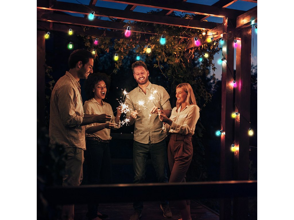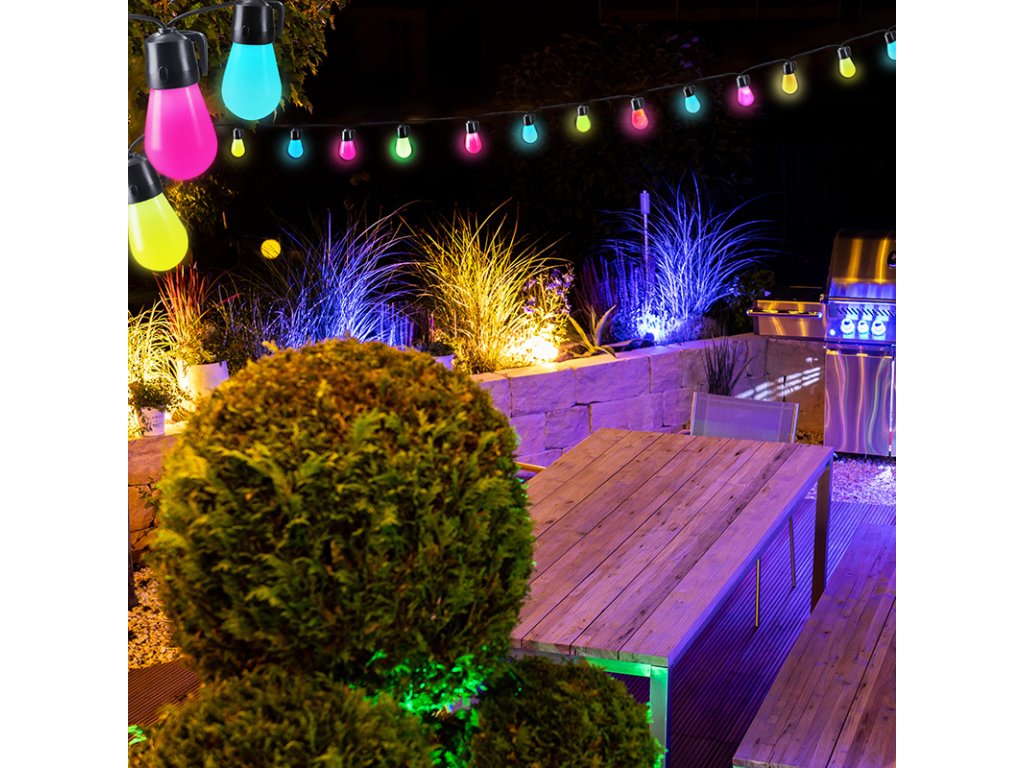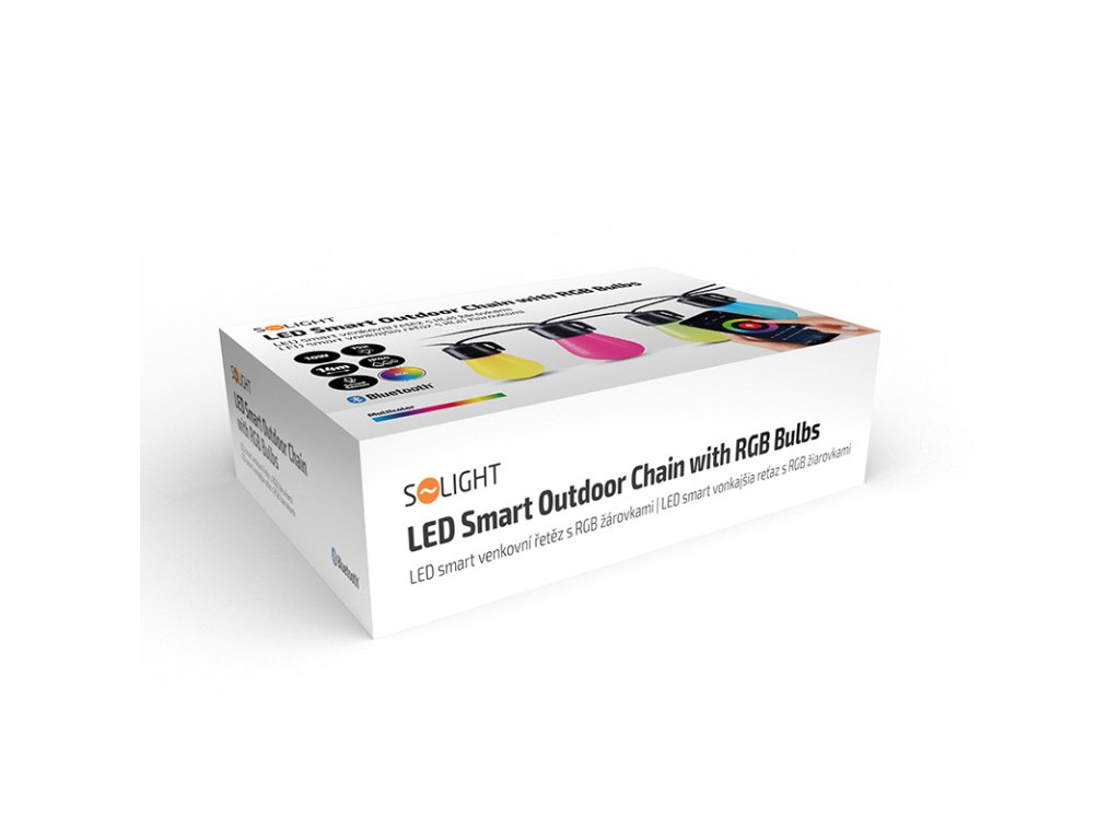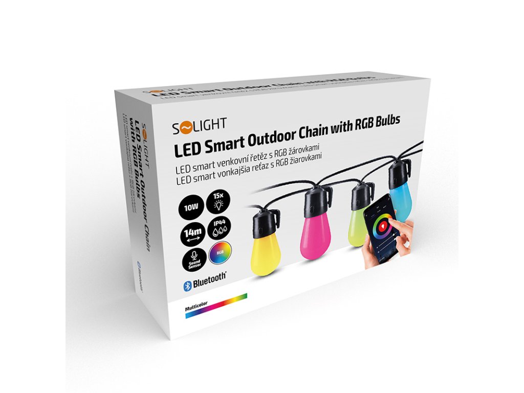 Solight LED smart venkovní řetěz s RGB žárovkami, bluetooth, 15 žárovek, 14m+6m, 10W