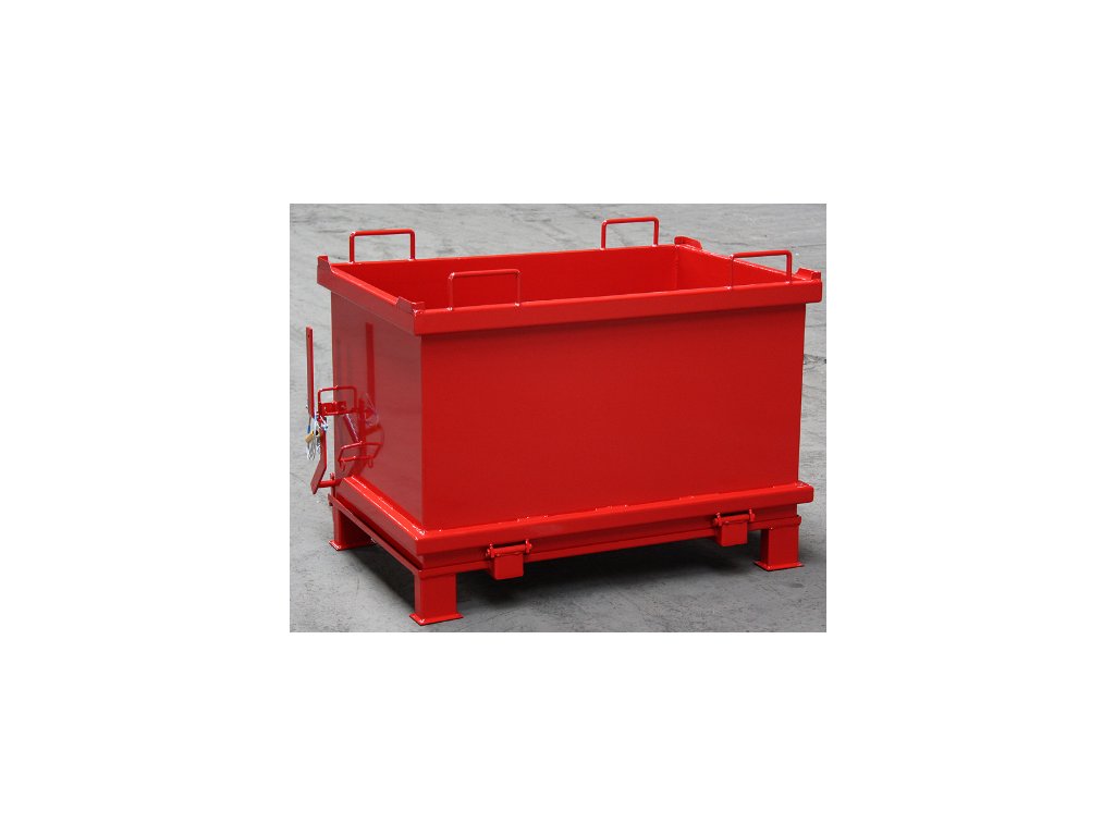 Stabilní a robustní ocelová konstrukce z plechu tloušťky 3 mm, se zesíleným okrajovým profilem po celém obvodu. Úchyty navařené na horním okraji pro manipulaci vysokozdvižným vozíkem, šířka úchytu je 200 mm, rozteč 830 mm. Dno se odjišťuje pomocí lanka přímo z místa řidiče, položením na pevný podklad se klapka automaticky sama uzavře a zajistí. Přepravník by měl být zajištěn řetězem proti nechtěnému sklouznutí z vidlic vozíku. Řetěz i ocelové lanko jsou součástí dodávky. Podjezdová výška 100 mm umožňuje dopravu i paletovým vozíkem. Vnitřní stěny kontejneru jsou hladké, umožňují snadné čištění a údržbu. Včetně kapes pro vidlice vysokozdvižných vozíků.