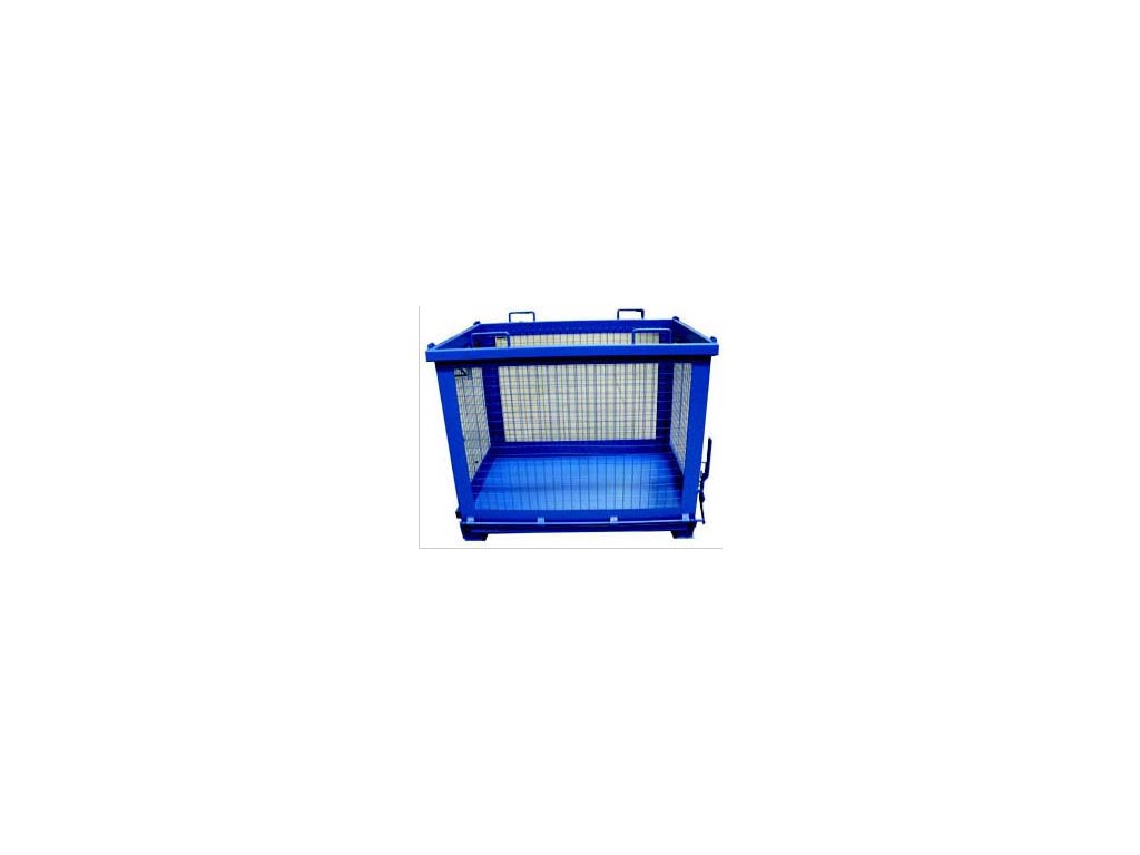 Stabilní a robustní ocelová konstrukce z plechu tloušťky 3 mm, se zesíleným okrajovým profilem po celém obvodu. Úchyty navařené na horním okraji pro manipulaci vysokozdvižným vozíkem, šířka úchytu je 200 mm, rozteč 830 mm. Dno se odjišťuje pomocí lanka přímo z místa řidiče, položením na pevný podklad se klapka automaticky sama uzavře a zajistí. Přepravník by měl být zajištěn řetězem proti nechtěnému sklouznutí z vidlic vozíku. Řetěz i ocelové lanko jsou součástí dodávky. Podjezdová výška 100 mm umožňuje dopravu i paletovým vozíkem. Vnitřní stěny kontejneru jsou hladké, umožňují snadné čištění a údržbu. Včetně kapes pro vidlice vysokozdvižných vozíků.