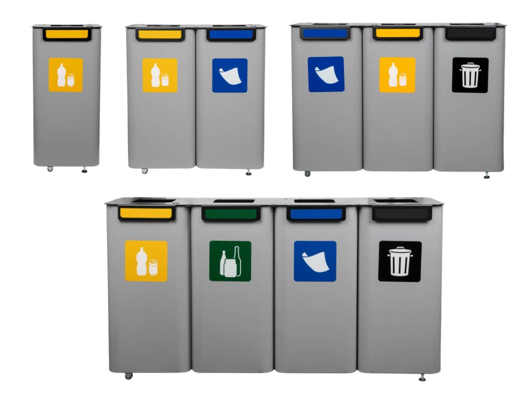 Sada čtyř kovových venkovních odpadkových košů pro třídění odpadu je vhodná pro veřejná prostranství, školy, úřady nebo komerční areály. Vyrobena z galvanizované oceli s práškovou barvou, zaručuje vysokou odolnost vůči počasí i mechanickému opotřebení. Každý modul je opatřen víkem s piktogramem, madlem, kolečky a výškově nastavitelnými nožkami.