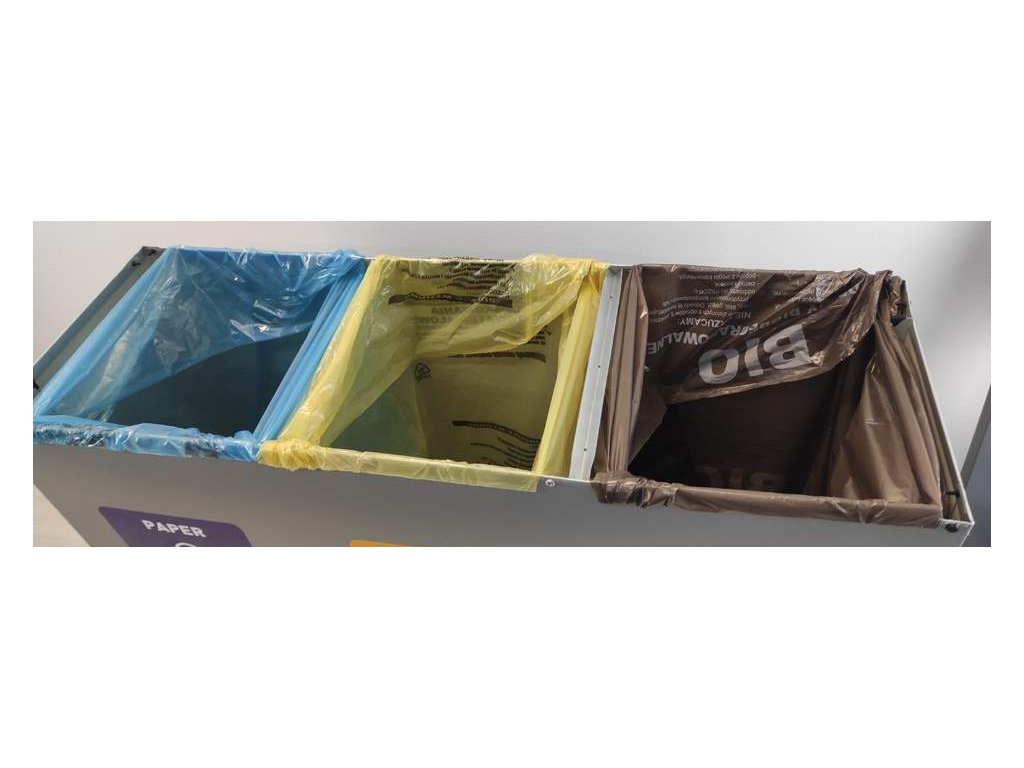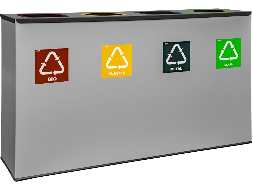 Moderní třídicí stanice o objemu 4×60 litrů je navržena pro efektivní třídění odpadu ve vnitřních prostorách – kancelářích, školách i domácnostech. Vyrobeno z lakované oceli, s plastovým podstavcem proti korozi a poškození podlahy. Koše jsou vybaveny horním víkem s otvory, držáky pytlů a barevnými samolepkami pro snadné rozlišení odpadu. Lze doplnit o vnitřní plastové nádoby.