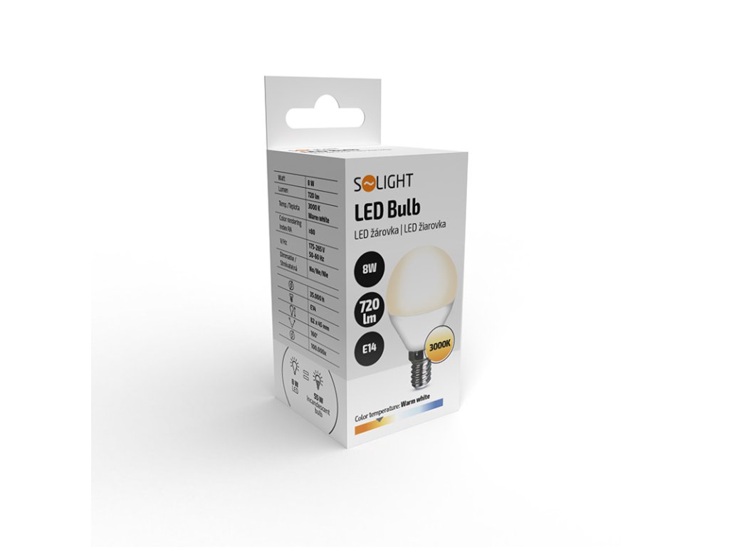 Solight LED žárovka, miniglobe, 8W, E14, 3000K, 720lm, bílé provedení