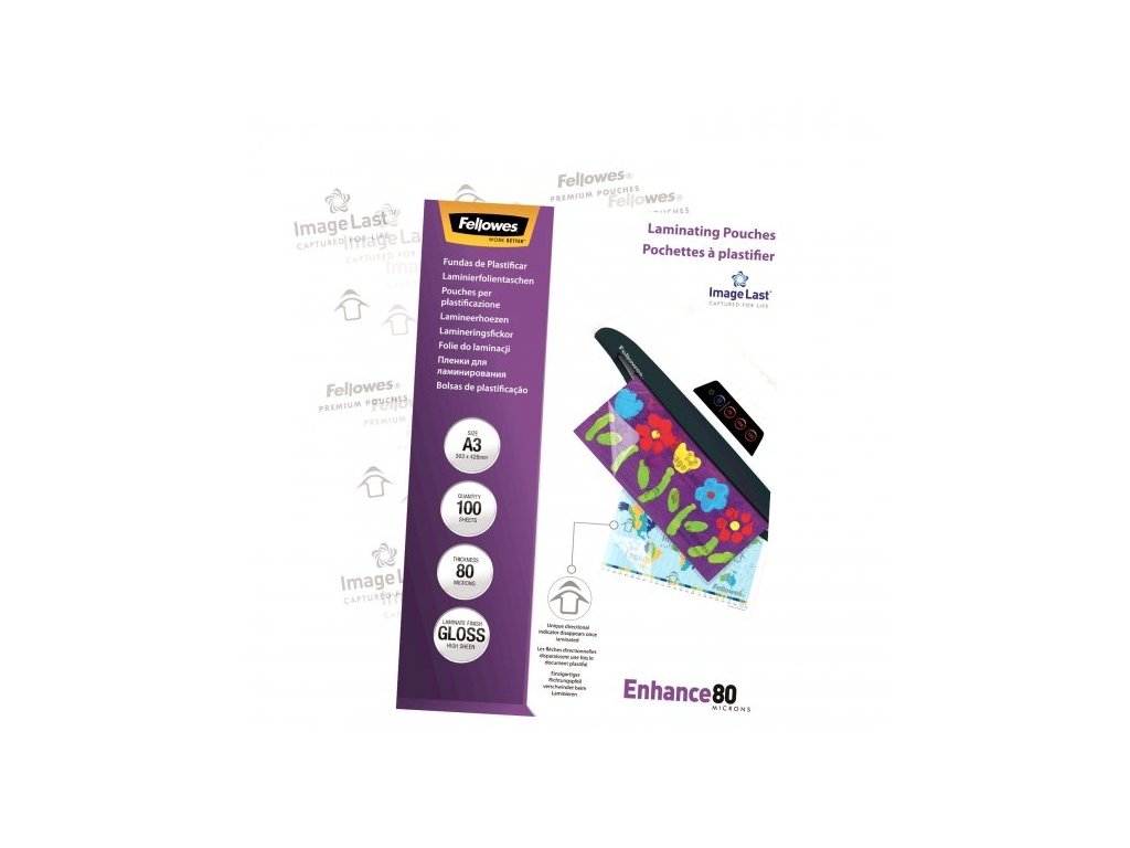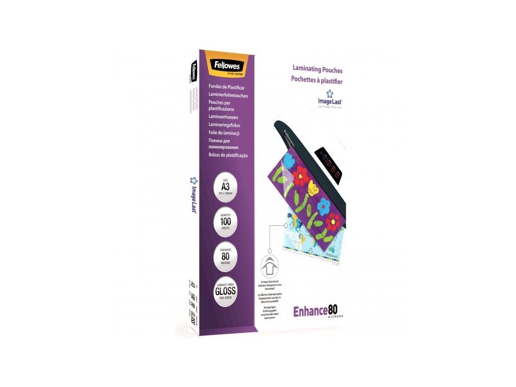 Enhance80. Zkrášlí a zvýrazní barevnost a celkový vzhled vašich dokumentů. Poskytnou jim ochranu proti nečistotám, vlhkosti a prodlouží jejich životnost. Prvotřídní laminovací fólie lesklé Fellowes ImageLast s šipkou směru laminace a logem, které po průjezdu nahřátým laminátorem vymizí. Vymizení znaků vás ujistí o optimální kvalitě laminace. Správná teplota laminátoru aktivuje lepivou složku fólie. Fólie je vyrobena s přesahem cca 3 mm na všech stranách oproti standadním formátům papíru. Vhodné pro laminaci za tepla pro všechny druhy stolních laminátorů. Doporučení nastavení teploty pro optimální laminaci: 80mic (90-110°C)Doplňkové parametry