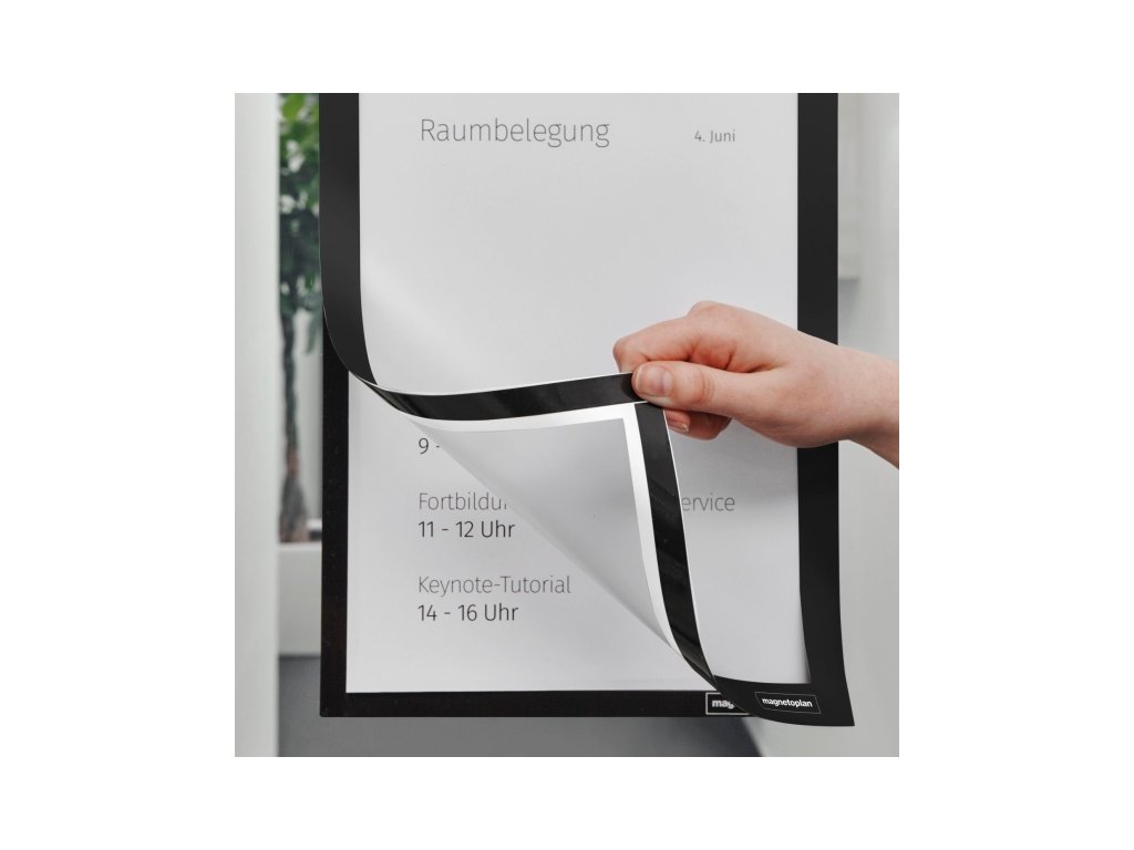 Samolepící magnetický rámeček Magnetofix, zvýrazní dokument. Pro formát velikosti A4 tj. 210x297 mm. Matný antireflexní povrch průsvitné fólie. Šířka barevného rámečku 9 mm. Samolepicí na zadní straně, informační rámeček bezpečně přilne ke všem hladkým povrchům, jako je kov, dlaždice, plast, jemná omítka atd. Na skle jsou rámečky a dokumenty viditelné z obou stran. Lze je odstranit bez zanechání zbytků a lze je flexibilně používat k pravidelné výměně dokumentů. Lze použít ve formátu na výšku i na šířku. Materiál: polypropylen (PP). Vhodné pro provozní informace v kancelářích, skladech, obchodech, výrobních provozech... Pod rámečkem vložený dokument lze velmi snadno vyměnit. Zvedněte jeden roh - vyměňte dokument - uhlaďte - HOTOVO!Doplňkové parametry