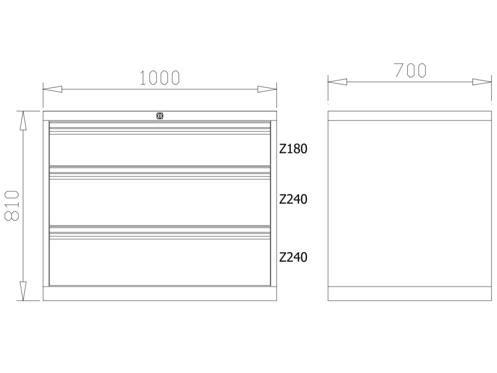 zásuvkový kontejner v x š x h: 810 x 1000 x 700 mm, hmotnost:95.0 kg, počet zásuvek:3, nosnost korpusu:300 kg, nosnost zásuvky:80 kg. Vnitřní prostor zásuvek je možné pro lepší přehlednost vybavit plechovými nebo plastovými dělícími prvky. Korpus skříně je v horní části vybaven rámečkem s gumou pro uložení nástrojů. Zásuvky jsou vedeny masivními výsuvy s vysokou nosností. Cylindrický zámek, dva klíče, 2000 kombinací, možnost dodání hlavního klíče. Zásuvková dílenská skříň je vybavena mechanismem blokace vysunutí více zásuvek najednou.