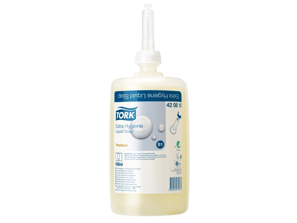 Tekuté mýdlo Tork, vhodné do potravinářství,1 litr-1000 dávek, jednorázová láhev včetně dávkovácí pumpičky. Hygiena je na prvním místě ve všech potravinářských oborech. Důležité jsou účinné roztoky na mytí rukou, které zaručí jejich perfektní čistotu. Všude tam, kde jsou velmi vysoké hygienické požadavky, je třeba používat dezinfekční prostředky na ruce. Časté mytí rukou může způsobit vysychání pokožky, doporučujeme proto ochranný krém, který pomáhá hydratovat a obnovit přirozené vlastnosti zdravé pokožky rukou. Nový systém Tork pro mytí a čištění rukou splňuje ty nejnáročnější požadavky a zajišťuje dokonalou hygienu. Zásobník tekutého mýdla a nový design obalů mýdel a čistících prostředků byly optimalizovány tak, aby fungovaly v dokonalé harmonii a aby je bylo možné snadno a rychle doplňovat. Nová jednorázová dávkovací pumpička zaručuje, že uživateli se při každém pužití dostane 1 ml mýdla nebo čistícícho prostředku, což je dostatečné množství pro řádné umytí a očištění rukou. Tím se zabraňuje nadměrné spotřebě mýdla, což značně snižuje frekvenci doplňování a výměny náplně v zásobníku.Doplňkové parametry