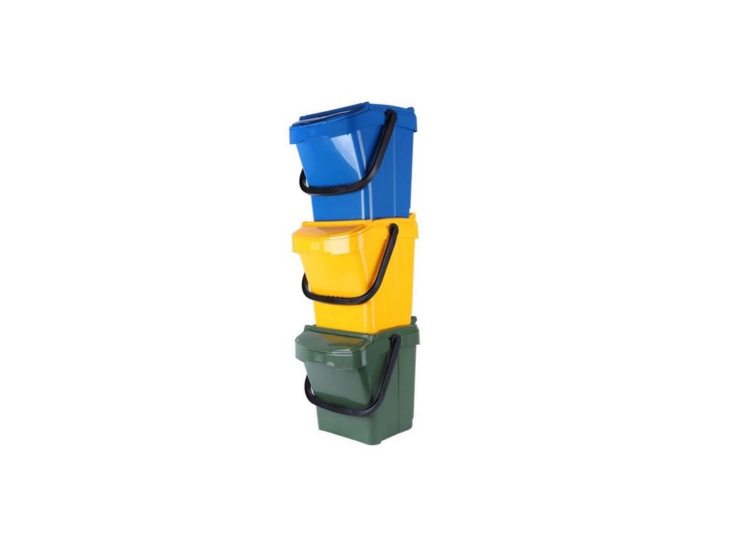 Praktická trojitá sestava nádob na třídění odpadu s barevným rozlišením (modrá, žlutá, zelená), vhodná do kanceláří, škol, nemocnic i domácností. Díky stohovatelnému provedení zabírá minimum místa a umožňuje pohodlné plnění i při uložení nádob na sobě.
