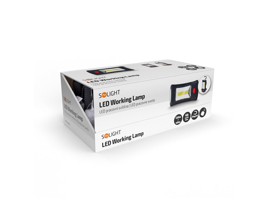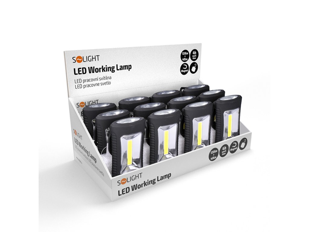 Solight LED svítilna pracovní, 120+40lm, 3W COB + 3 SMD LED, hák + magnet, 3 x AAA