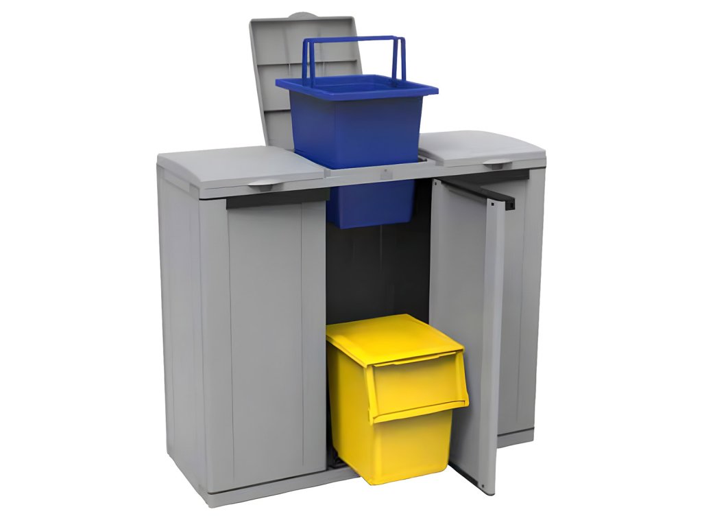 Elegantní a praktická plastová skříň vhodná pro vnitřní i kryté vnější použití (odolná dešti). Kombinuje atraktivní design s funkčností pro efektivní třídění odpadu.