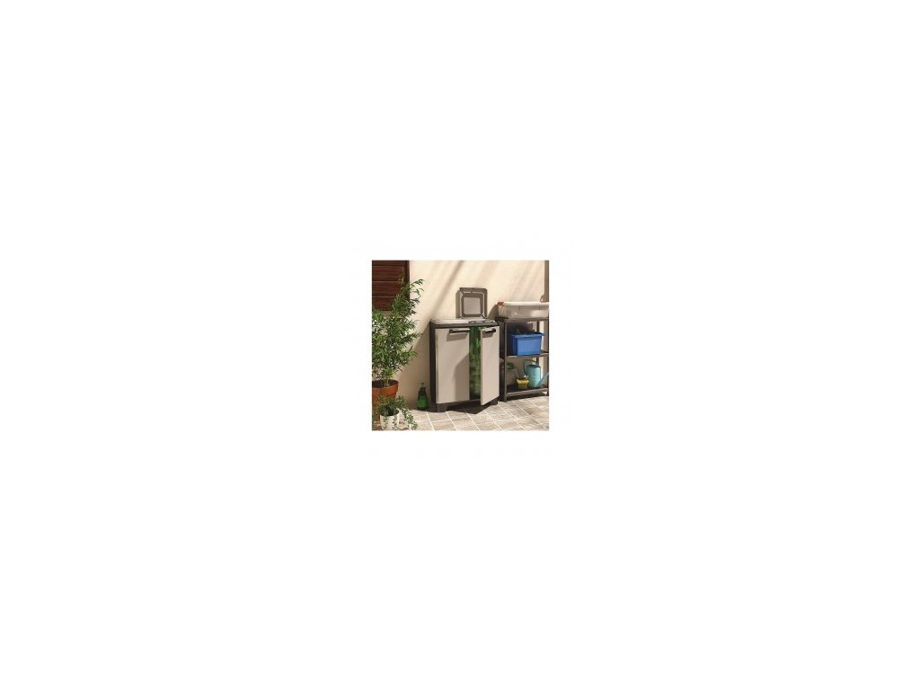 Praktické řešení pro třídění odpadu nabízí horní otvor pro pohodlné vhazování a přední dvířka pro rychlou výměnu pytlů. Skříň je snadno sestavitelná, stabilní a díky kompaktním rozměrům ideální pod přístřeškem i do vnitřních prostor.