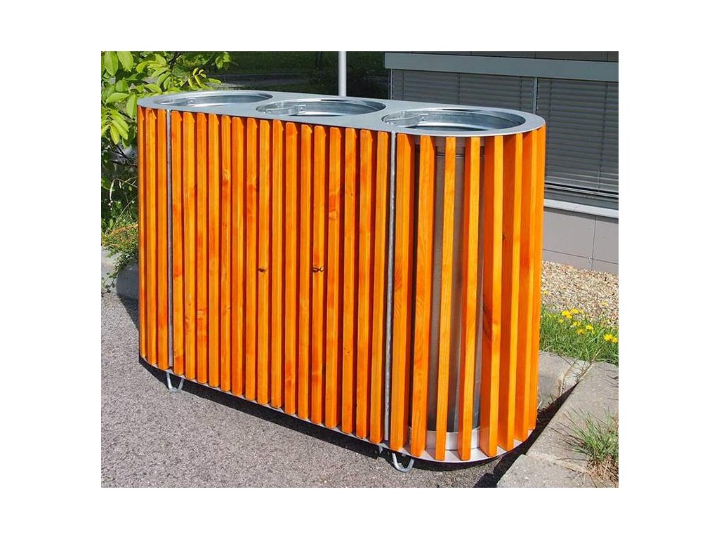 Elegantní tříděný koš vhodný pro parky, hřiště, zahrady i moderní interiéry. Konstrukce je tvořena pevnou svařovanou ocelí lakovanou stříbrným práškovým lakem, která je obložena masivními dřevěnými latěmi. Dřevo je ošetřeno speciálním lakem pro venkovní použití. Každá ze tří vnitřních pozinkovaných vložek je vybavena madly pro snadnou manipulaci. Koš je připraven pro kotvení do podkladu.
