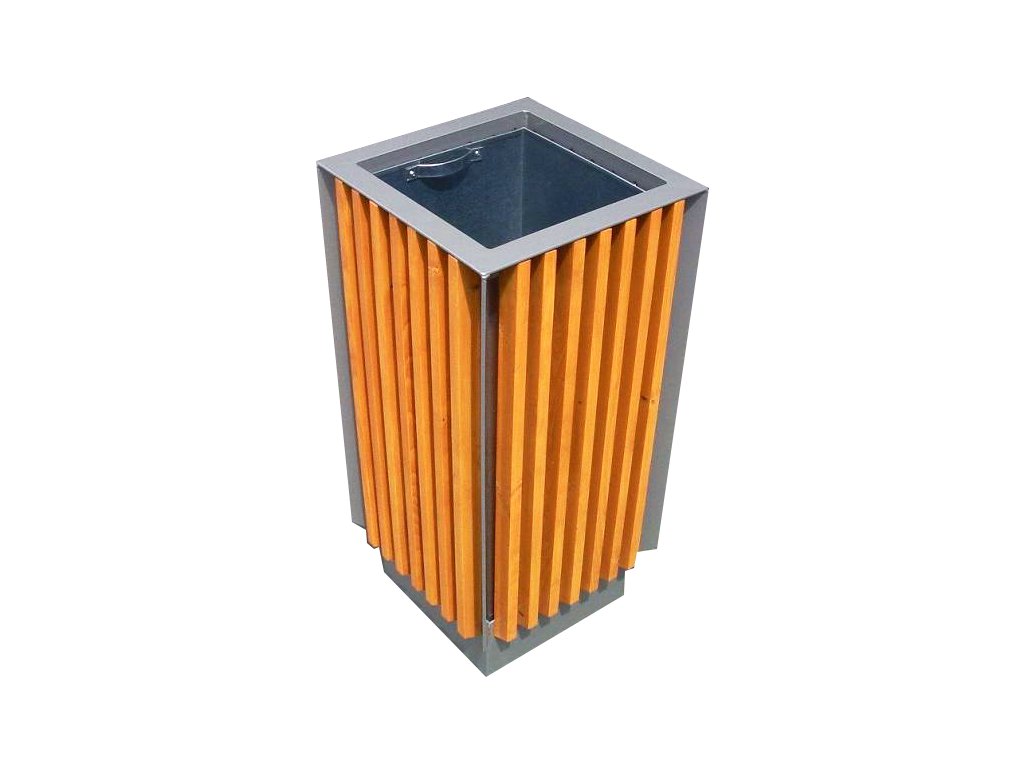 Esteticky zpracovaný odpadkový koš se svařovanou ocelovou konstrukcí a obložením z masivních dřevěných latí. Dřevo je mořeno lakem pro venkovní použití, konstrukce je opatřena stříbrným práškovým lakem (RAL 9007) pro ochranu proti povětrnostním vlivům. Vnitřní vyjímatelná vložka z pozinkovaného plechu má dva úchyty pro snadnou manipulaci. Koš je možné kotvit do země.