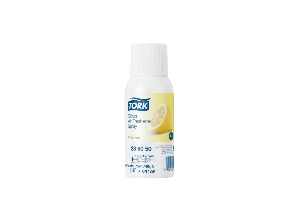 Tork nabízí výběr parfemovaných osvěžovačů vzduchu pro místa, kde je požadován spolehlivý, jednoduše ovladatelný výrobek. Tork Premium Airfreshener Aerosol je automatický systém osvěžování a kontroly vzduchu, který v pravidelných intervalech dávkuje do místnosti dlouhotrvající vůni. Pro zajištění toho, že Vaše toaleta zůstane svěží po celých 24 hodin nabízí Tork výběr z vůní pro osvěžovače vzduchu pro místa, na kterých potřebujete spolehlivé, jednoduše udržovatelné výrobky. Vůně do osvěžovače Tork - citrusová. Eliminuje nepříjemný zápach: příjemnější toalety. Svěží: 24 hodin denně.
