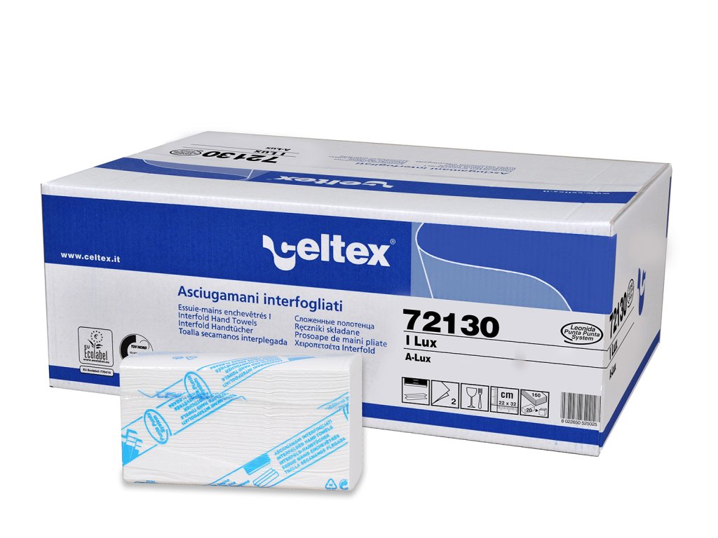 Ručníky papírové skládané CELTEX LUX, třikrát složený ručník v rozměru 22x32cm, 3200ks Dvouvrstvé papírové ručníky CELTEX, skládané,bílé ze 100% celulózy ideální poměr mezi cenou a kvalitou. Jeden ručník v daný okamžik: snížená spotřeba, zlepšená hygiena. Dobrá kapacita absorpce: efektivní osušení rukou. Jeden balíček obsahuje 160 útržků.Doplňkové parametry