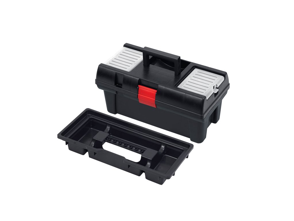 Kufr na nářadí z odolného plastu s vnitřní vyjímatelnou miskou s přihrádkami pro menší nářadí. Na víku jsou další přihrádky pro drobný materiál. Plastové klipy a otvor pro uzamčení visacím zámkem.