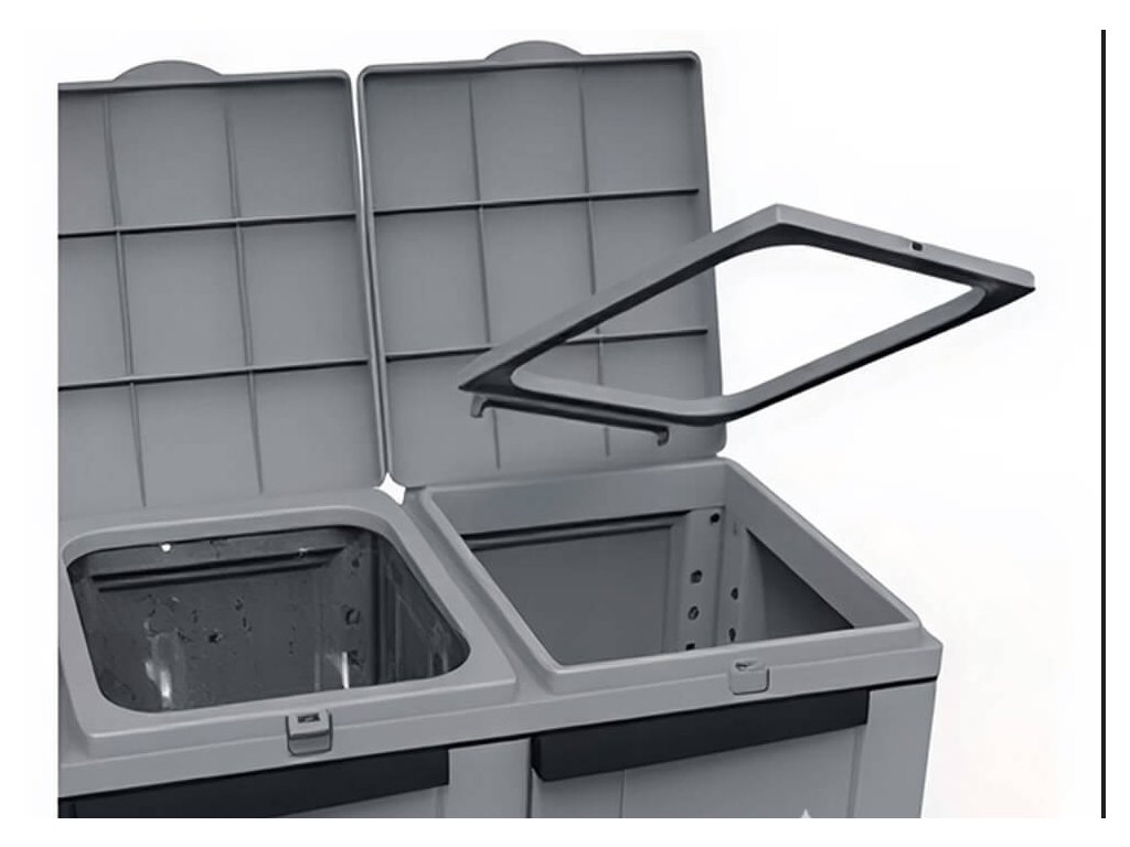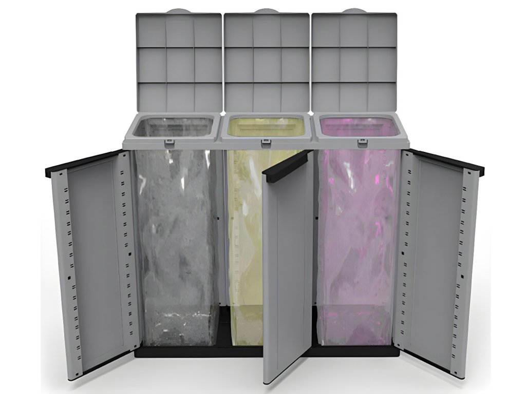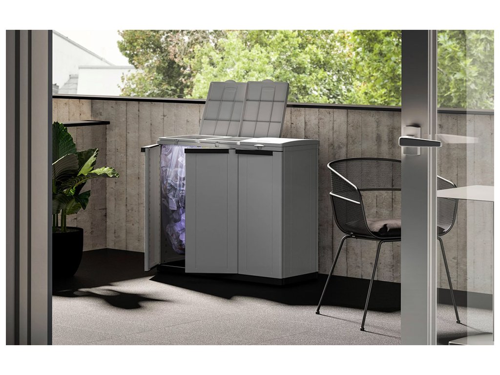 Elegantní a praktická plastová skříň vhodná pro vnitřní i kryté vnější použití (odolná dešti). Kombinuje atraktivní design s funkčností pro efektivní třídění odpadu.