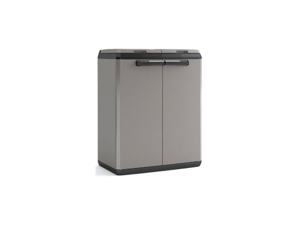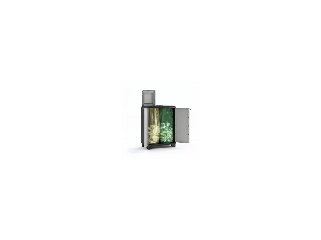 Praktické řešení pro třídění odpadu nabízí horní otvor pro pohodlné vhazování a přední dvířka pro rychlou výměnu pytlů. Skříň je snadno sestavitelná, stabilní a díky kompaktním rozměrům ideální pod přístřeškem i do vnitřních prostor.