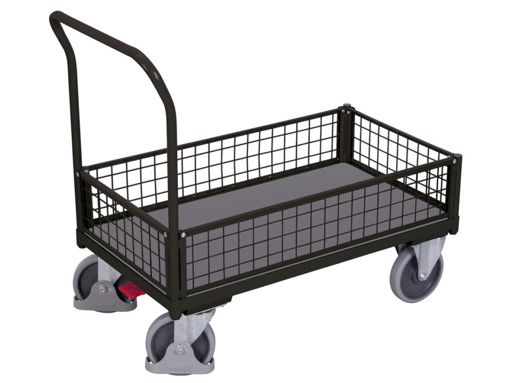 Manipulační vozíky s pevnou ocelovou konstrukcí, madlem a mřížovými bočnicemi o výšce 200 mm.