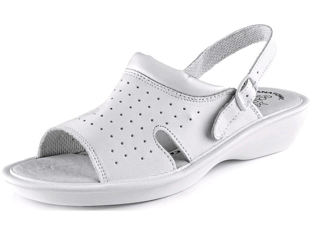 Sandál, dámský, celokožený, perforovaný s páskem kolem paty. Materiál: svršek z přírodní kůže, anatomicky tvarovaná stélka z vepřové kůže, PU podešev.Doplňkové parametry