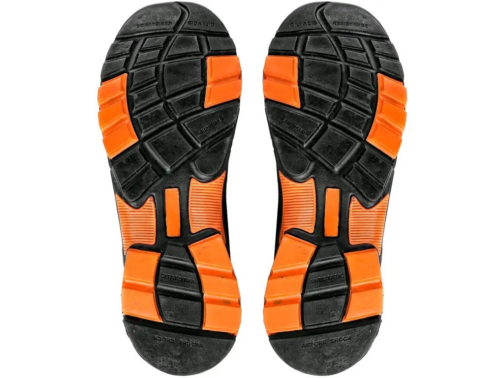 Bezpečnostní polobotka s ocelovou špicí, reflexní doplňky. Materiál: svršek z 1,4 - 1,6 mm hovězí broušené kůže kombinovaný s prodyšnou tkaninou, podšívka z prodyšné oděru odolné textilie, podešev: gumová, olejivzdorná, antistatická, protiskluzová.Doplňkové parametry