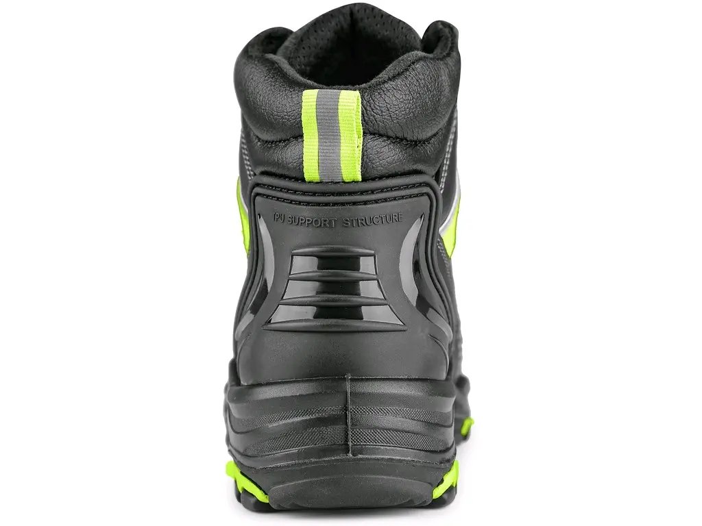 Bezpečnostní kotníková obuv s kompozitovou špicí a planžetou Dyna-Flex®, bez kovových součástí, reflexní doplňky. Materiál: svršek z 1,8 - 2 mm kvalitní hovězí lícové kůže, límec z vepřové kůže, jazyk z 0,7 - 0,8 mm hovězí kůže, robustní PU ochrana proti okopu, masivní TPU ochrana paty, prodyšná a oděruvzdorná mesh podšívka, velmi pohodlná, anatomická a vyjímatelná stélka s paměťovou pěnou, podešev: PU/guma, protiskluzová, antistatická, olejivzdorná, odolná proti propichu a kontaktnímu teplu do 300 °C.Doplňkové parametry