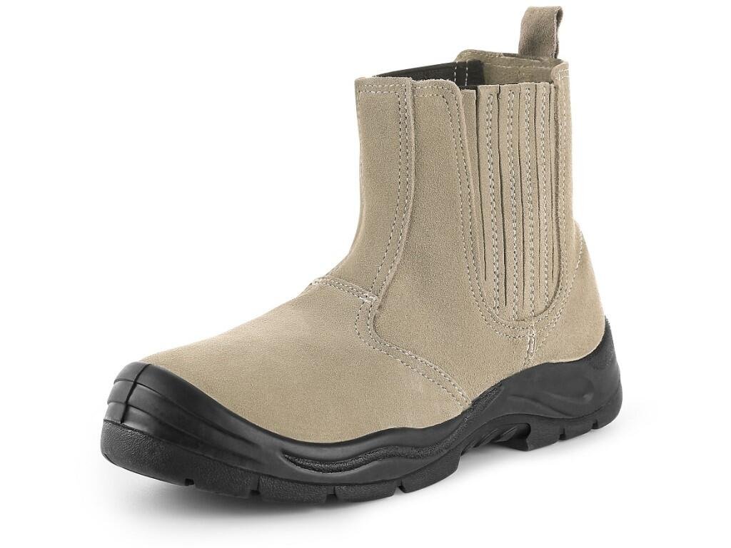 Celokožená kotníková obuv s ocelovou špicí a krytou pružinkou. Materiál: svršek z kvalitní 2 - 2,2 mm hrubé hovězí broušené kůže, krytá gumová pružinka pro rychlé vyzutí, podšívka: 1,2 - 1,4 mm hovězí broušená kůže, podešev: PU-guma, antistatická, olejivzdorná, protiskluzová, odolná vůči kontaktnímu teplu do 300 °C.Doplňkové parametry