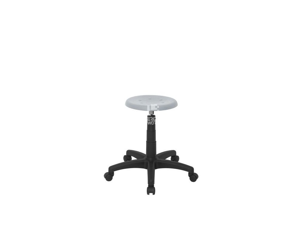 Nízká otočná laboratorní stolička. Protiskluzový sedák z měkkého polyuretanu v šedé barvě (RAL 7040). Nastavení výšky sedáku plynovým pístem. Černý plastový nosný kříž osazený tvrdými koly pro měkké povrchy.Doplňkové parametry