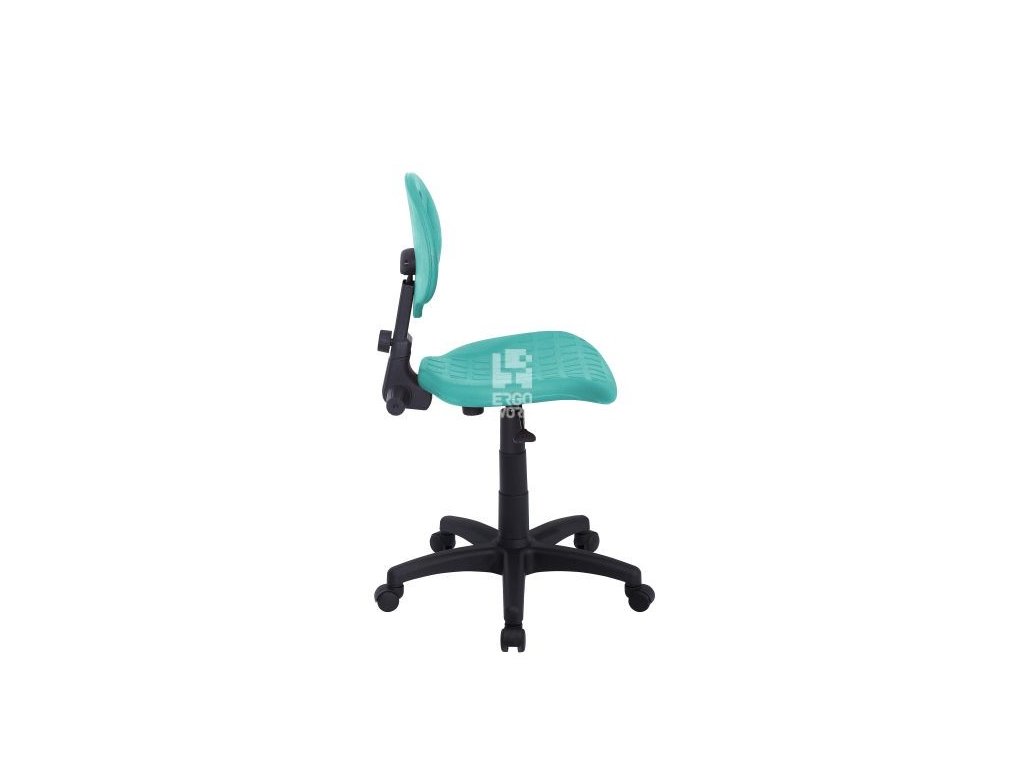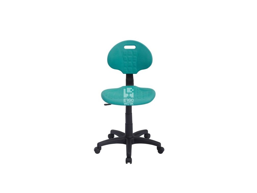 Nízká otočná laboratorní židle. Opěrák a protiskluzový sedák z měkkého polyuretanu v zelené barvě (RAL 6033). Nastavení výšky sedáku plynovým pístem. Pevná základna z polyamidu se skelným vláknem, na kolečkách.Doplňkové parametry