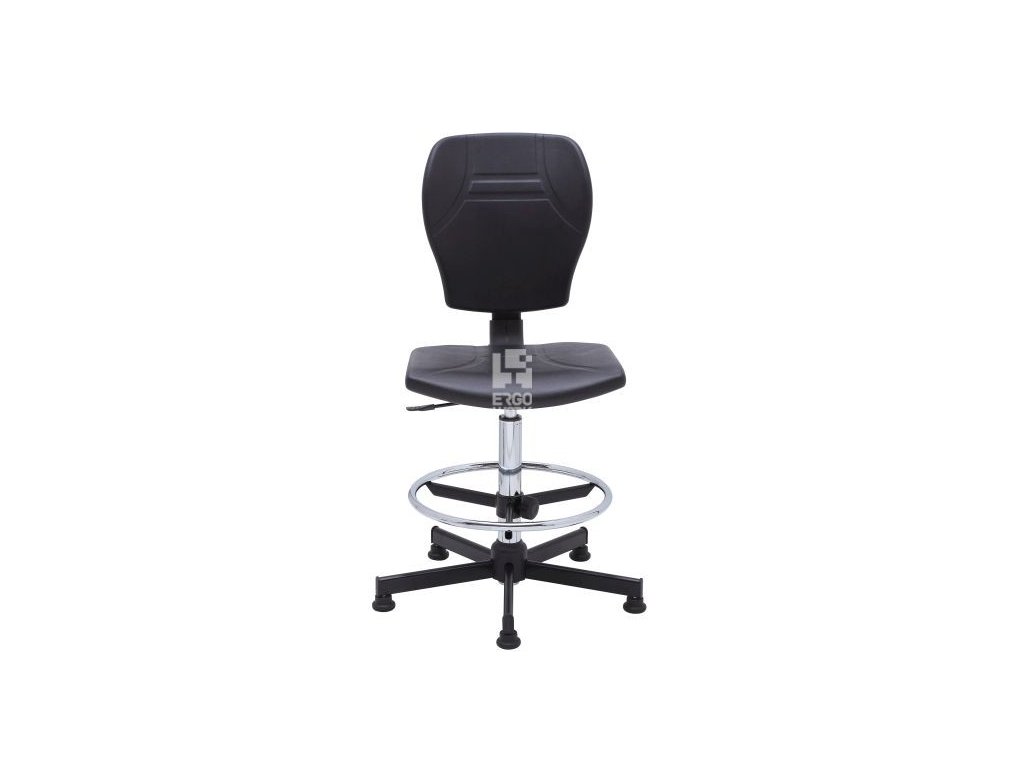 Otočná vysoká laboratorní židle. Opěrák a protiskluzový sedák z měkkého polyuretanu v černé barvě (RAL 9005). Nastavení výšky sedáku plynovým pístem. Vybaveno nastavitelnou chromovou opěrou na nohy. Černá kovová základna. Vysoká židle k dispozici pouze na kluzácích (na kolech by nebyla bezpečná).Doplňkové parametry