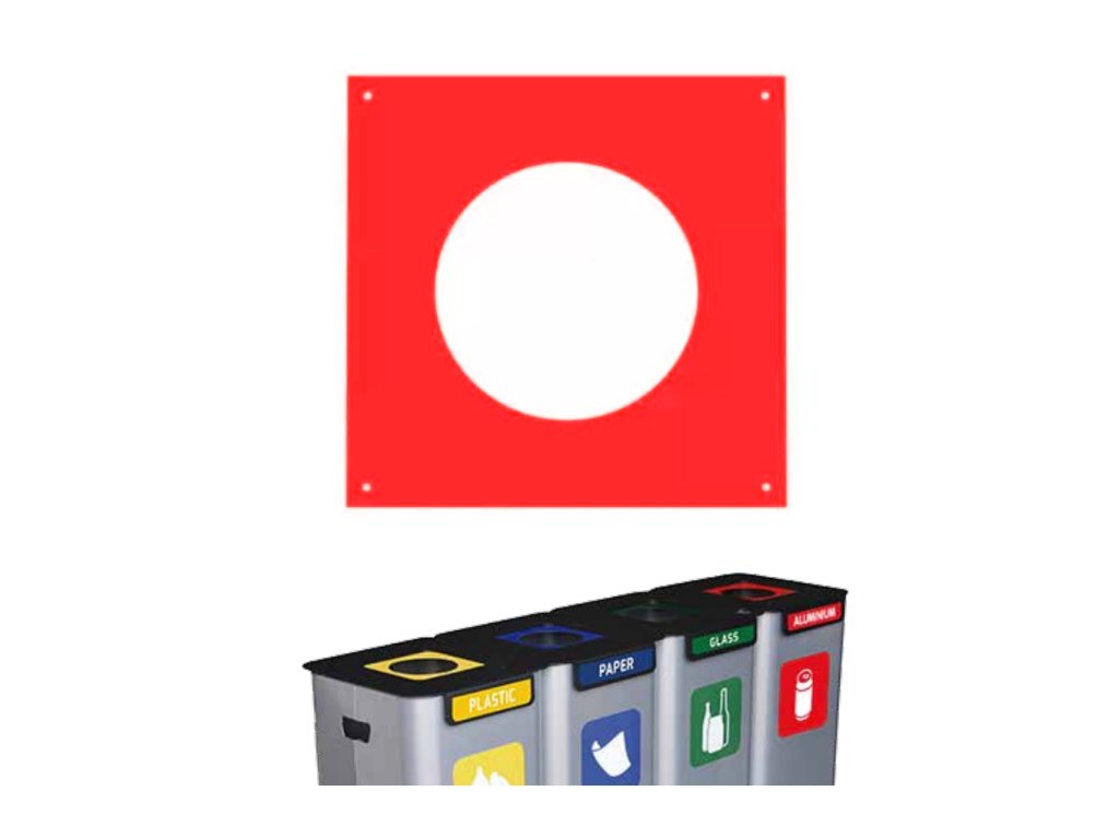 Čtvercový vymezovač vhozu pro odpadkový koš Modular umožňuje přesně definovat typ a velikost odpadu vhazovaného do koše. Zásuvný otvor na víku koše slouží k upevnění vymezovače, jehož barva odpovídá tříděnému materiálu – v tomto případě například pro kov.
