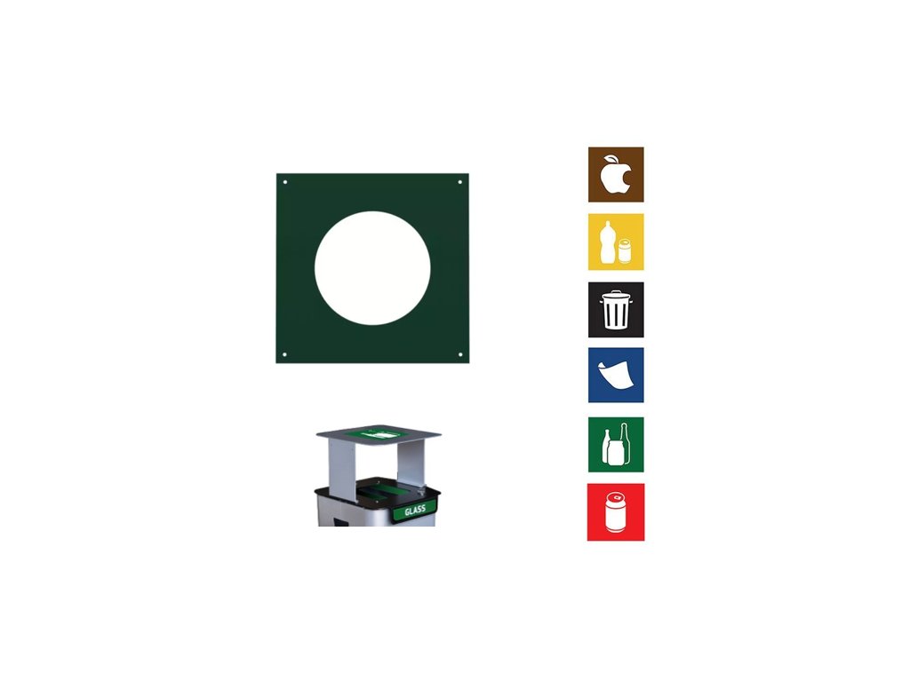Čtvercový vymezovač vhozu pro odpadkový koš Modular je určen k přesnému vymezení typu odpadu, který je možné vhazovat. Vkládá se do zásuvného otvoru ve víku a barevné provedení odpovídá druhu odpadu – v tomto případě sklo.