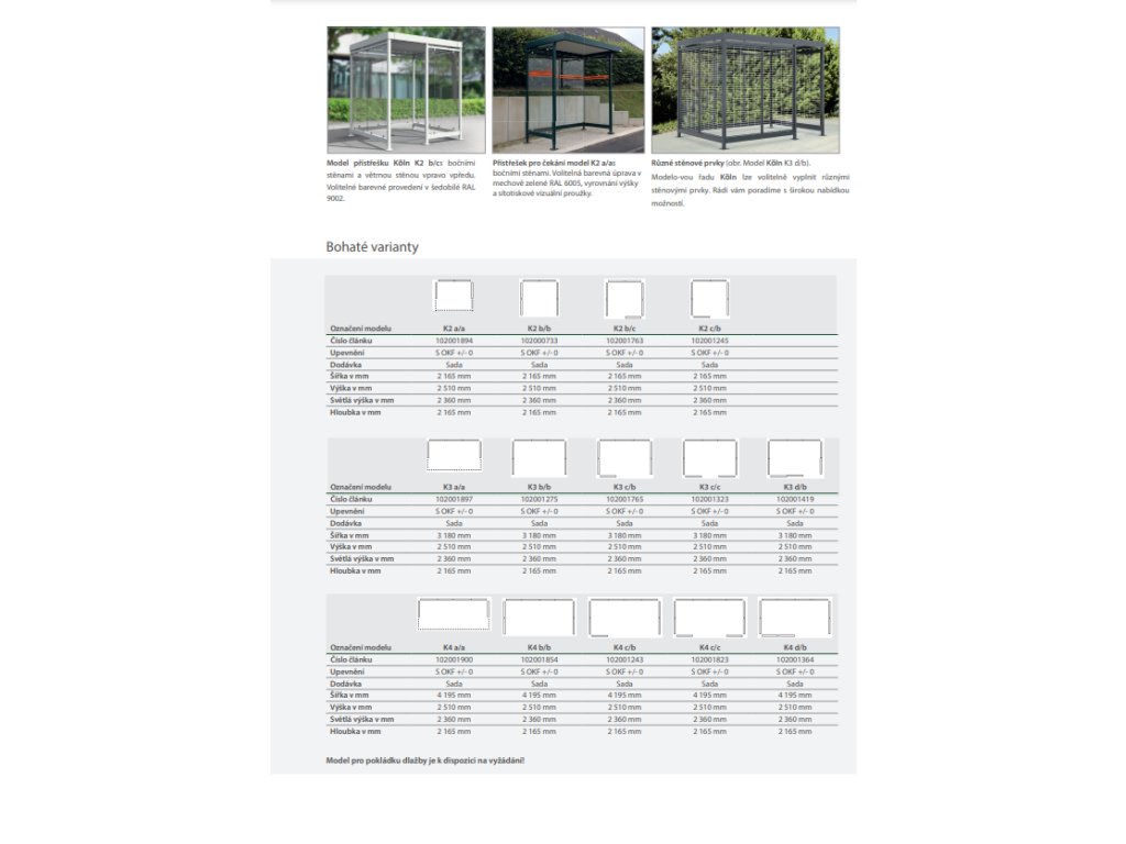 Flexibilní a modulární přístřešek určený zejména pro zastávky veřejné dopravy. Díky modulární konstrukci je možné přizpůsobit délku i šířku střechy dle potřeb projektu. Zadní a boční stěny lze osadit bezpečnostním tvrzeným sklem nebo jinými vhodnými materiály. Přístřešek umožňuje také provedení s chráněným interiérem a přístupovými dveřmi. Žárově pozinkovaná ocelová konstrukce s možností lakování v odstínech RAL garantuje dlouhou životnost i při vysokém zatížení větrem a sněhem. Dodávka probíhá ve formě stavebnice s montážním návodem.