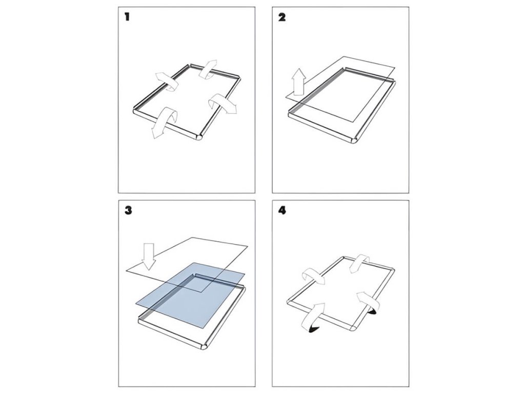 Jednoduše odklopte přední profily směrem k sobě, vyměňte plakát, a profily opět zaklapněte.
