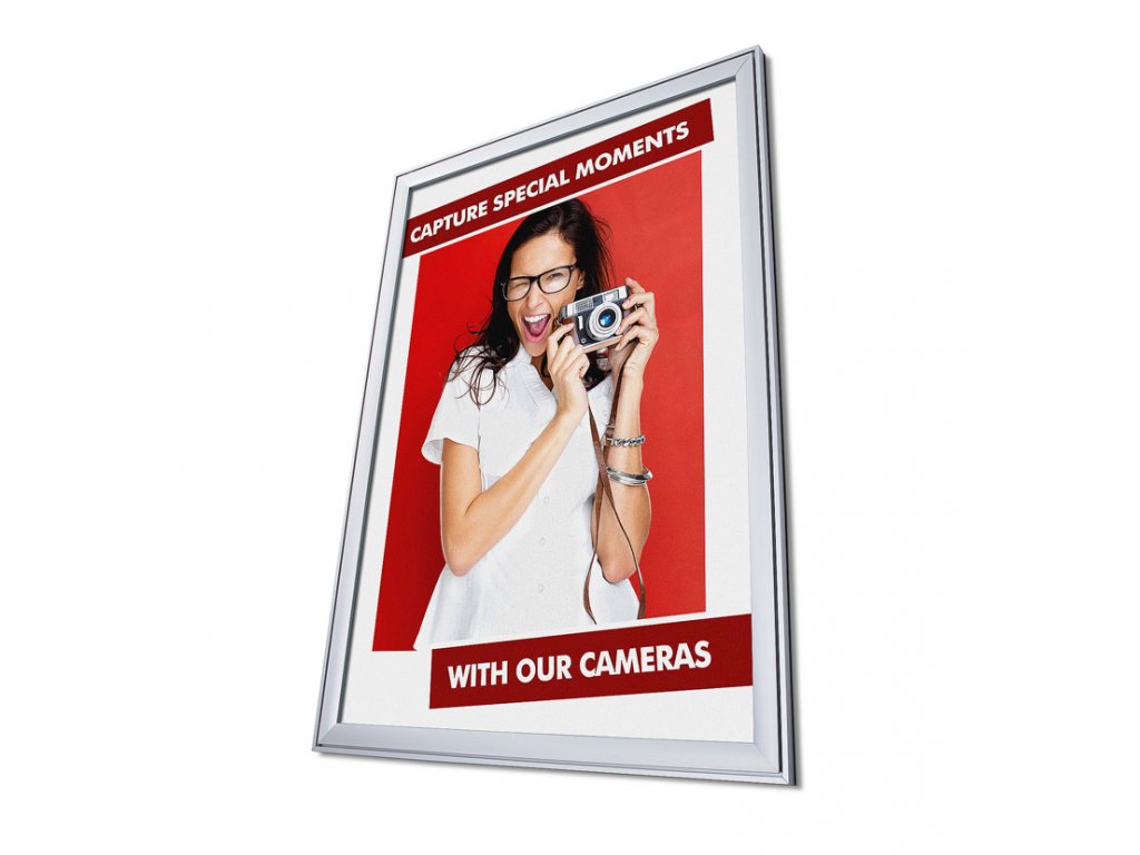 Designový plakátový rám s voděvzdornou folií. Vhodný pro venkovní prostory. Standardně připraven pro instalaci na stěnu. Klaprámy jsou vhodné pro prezentaci plakátů, letáků apod. Umožňují rychlou a snadnou obměnu obsahu odklopením bočních hliníkových profilů. Zadní stěna je z šedého plastu, čelní z antireflexní UV fólie. Klaprám je možno umístit na šířku i výšku.