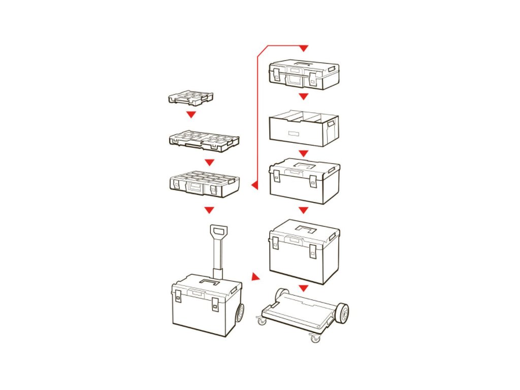 - kompatibilní – systém Qbrick System ONE umožňuje kombinování kufrů na nářadí, vozíků a úložných systémů