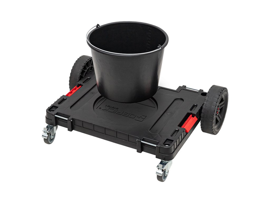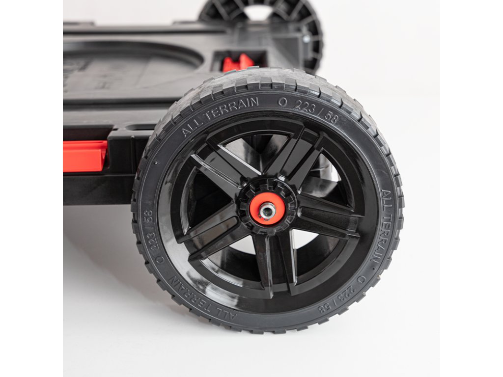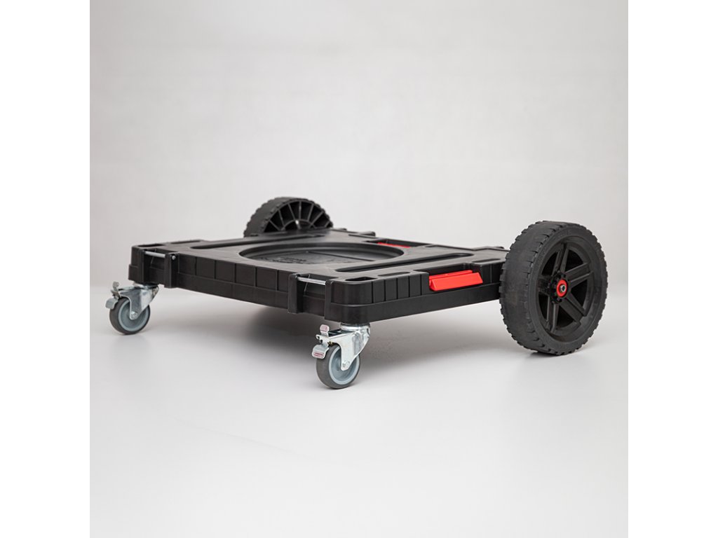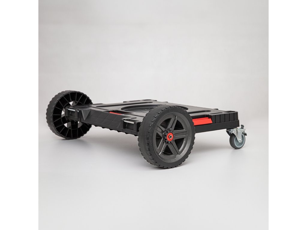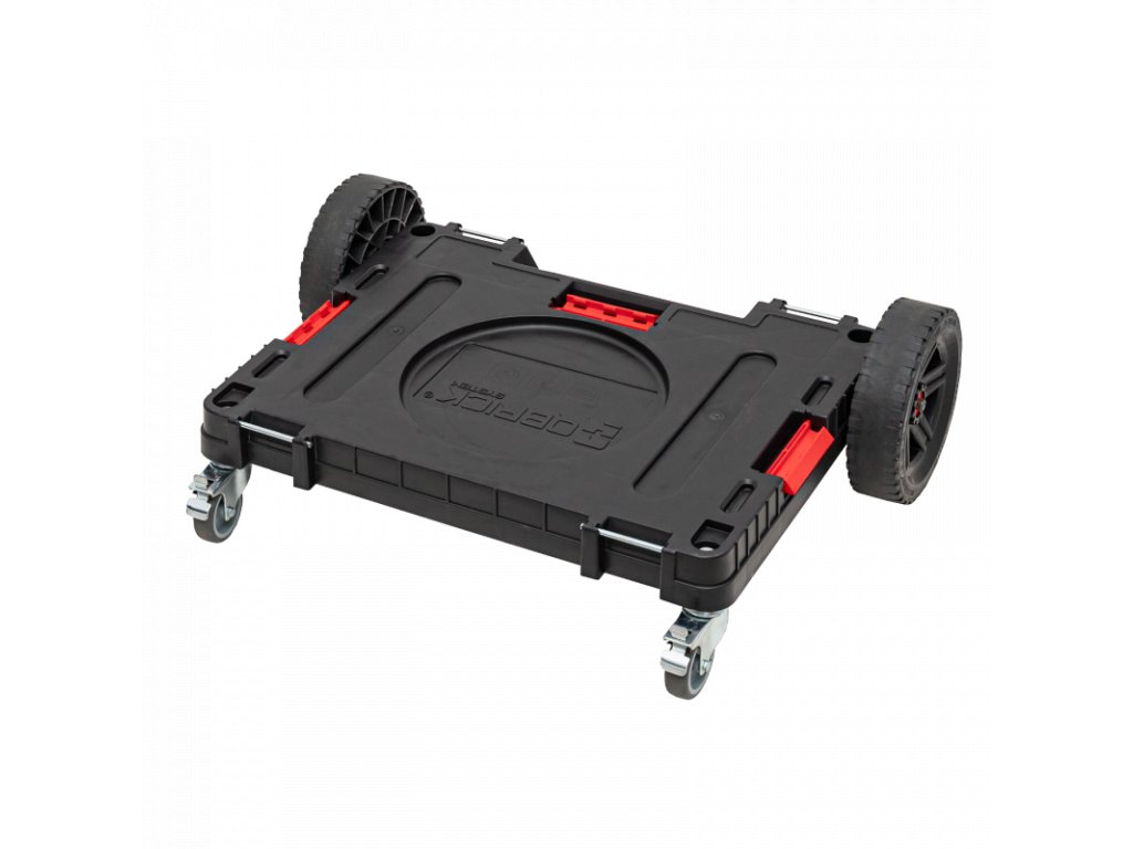 QBRICK SYSTEM ONE TRANSPORT PLATFORM 2.0 Allterrain - dvě přední velká odolná plastová a pogumovaná kola, upevněná na kovové nápravě, vám umožní protlačit překážky, jako jsou schody, rampy nebo bláto. Kovová otočná pogumovaná kola s brzdou zajišťují vynikající manévrovatelnost a chrání celou sadu před nechtěným pohybem.