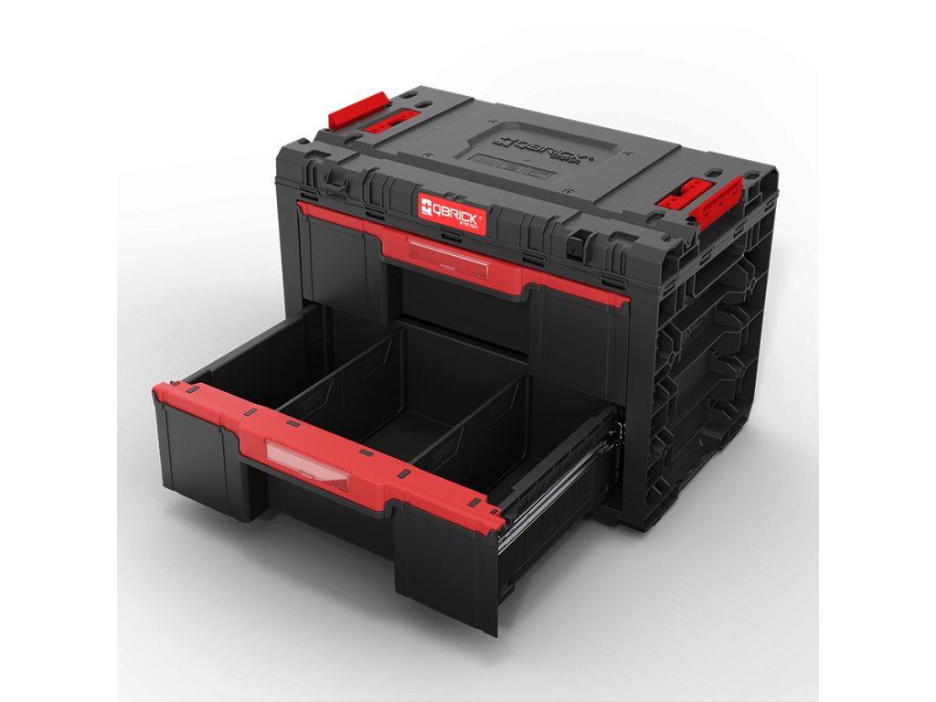 Qbrick System PRIME Drawer 2 Toolbox Basic - je velmi prostorný, modulární zásuvkový box na nářadí. Obsahuje dvě zásuvky, které se vysouvají po kovových výsuvech. Praktické tlačítko umožňuje snadný přístup k jejich obsahu.