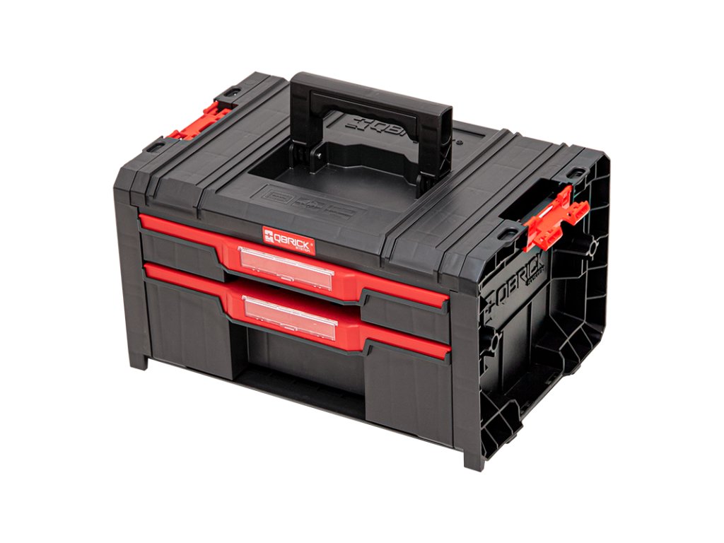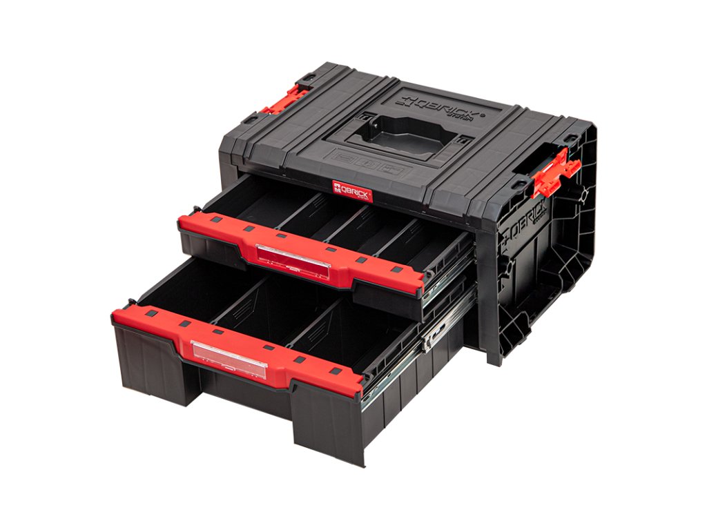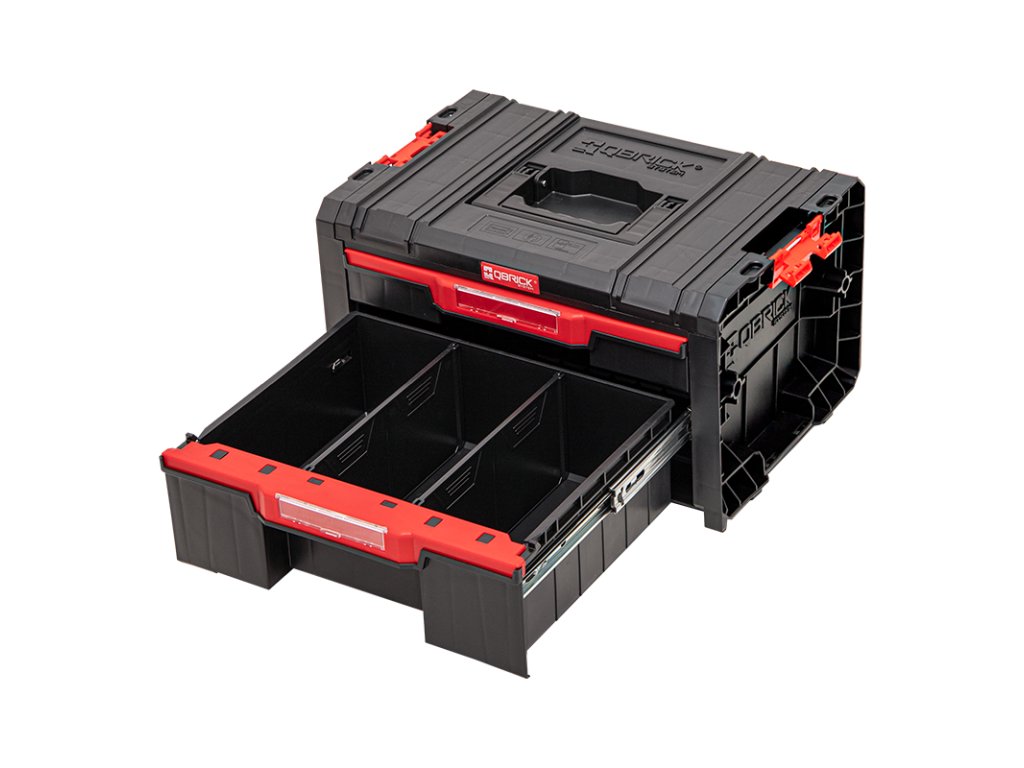 Qbrick System PRO Drawer 2 Toolbox 2.0 Basic je prostorný, modulární box vybaven dvěmi výsuvnými zásuvkami na kovových vodítkách. Tlačítko v zásuvce poskytuje snadný přístup k jejich obsahu, ale i blokuje samovolné otevření zásuvky. Zásuvky umožňují organizovat podélné i drobné dílenské komponenty, šroubky, těsnění a další předměty.