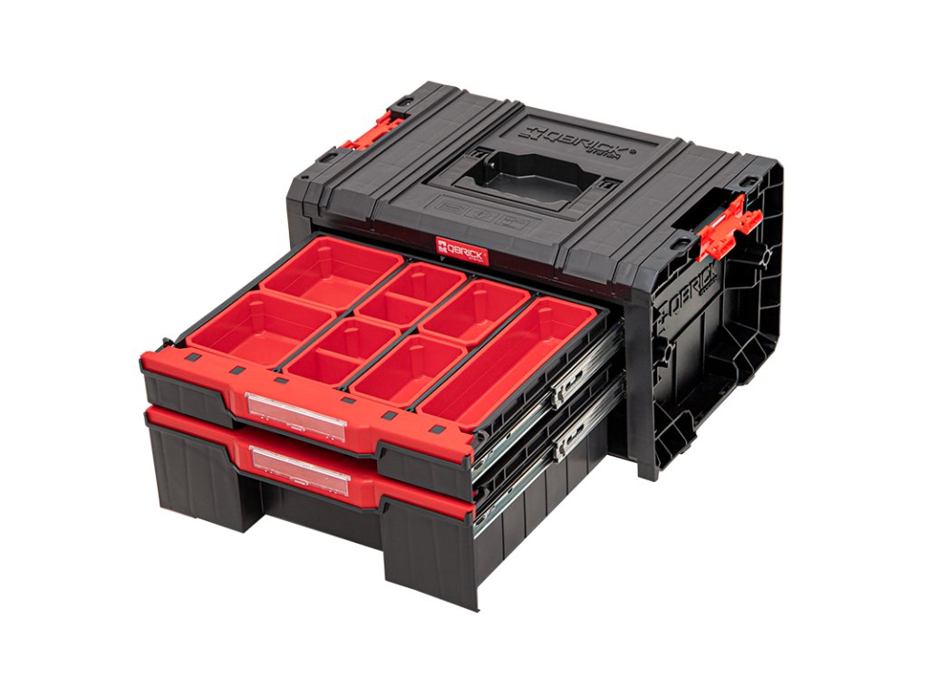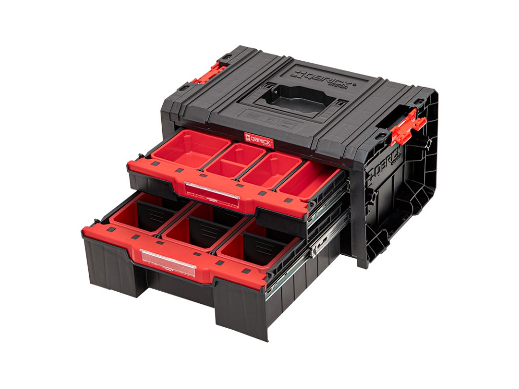 Qbrick System PRO Drawer 2 Toolbox 2.0 Expert je prostorný, modulární box vybaven třemi výsuvnými zásuvkami na kovových vodítkách. Tlačítko v zásuvce poskytuje snadný přístup k jejich obsahu, ale i blokuje samovolné otevření zásuvky. Zásuvky umožňují organizovat podélné i drobné dílenské komponenty, šroubky, těsnění a další předměty. Verze zásuvek Expert je vybavena nastavitelnými přepážkami a kontejnery, které umožňují organizovat podélné i drobné dílenské příslušenství.