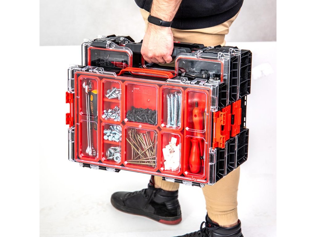 QBRICK SYSTEM PRO ORGANIZER 100 je nejkompaktnějším modelem řady PRO. Nejdůležitějšími výhodami tohoto organizéru jsou patentovaný systém snadného přístupu, těsnění ve víku, super odolné polykarbonátové víko, ergonomická rukojeť, boční konektory z polyamidu.