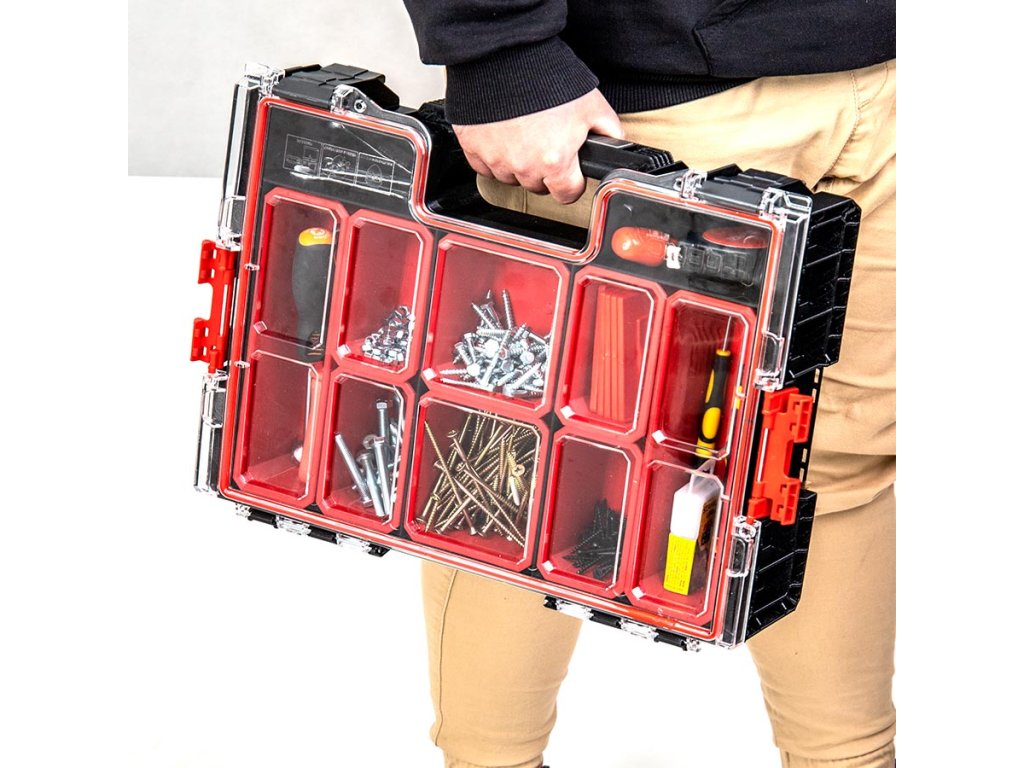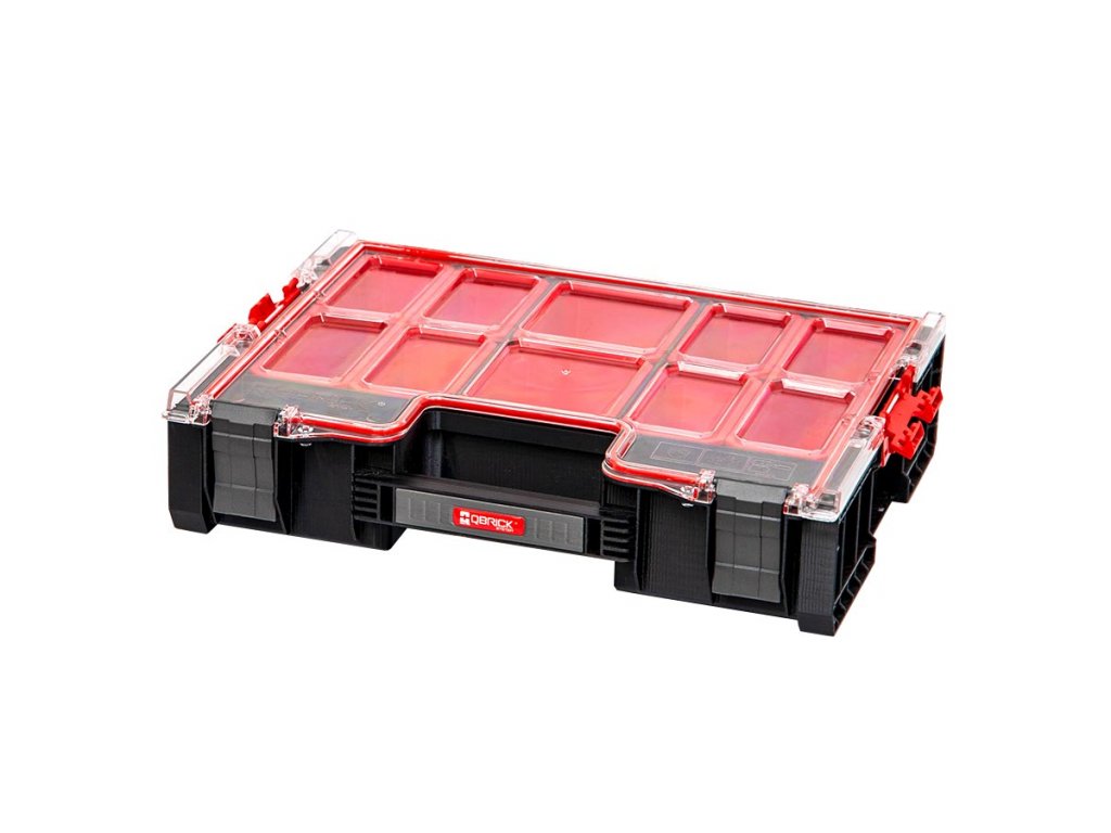 QBRICK SYSTEM PRO ORGANIZER 300 je největším organizérem řady PRO. Nejdůležitějšími výhodami tohoto organizéru jsou patentovaný systém snadného přístupu, těsnění ve víku, super odolné polykarbonátové víko, ergonomická rukojeť, boční konektory z polyamidu. V závislosti na verzi jsou organizéry k dispozici s 8 hlubokými boxy v různých velikostech nebo s vícevrstvými pěnovými vložkami pro vlastní uspořádání.