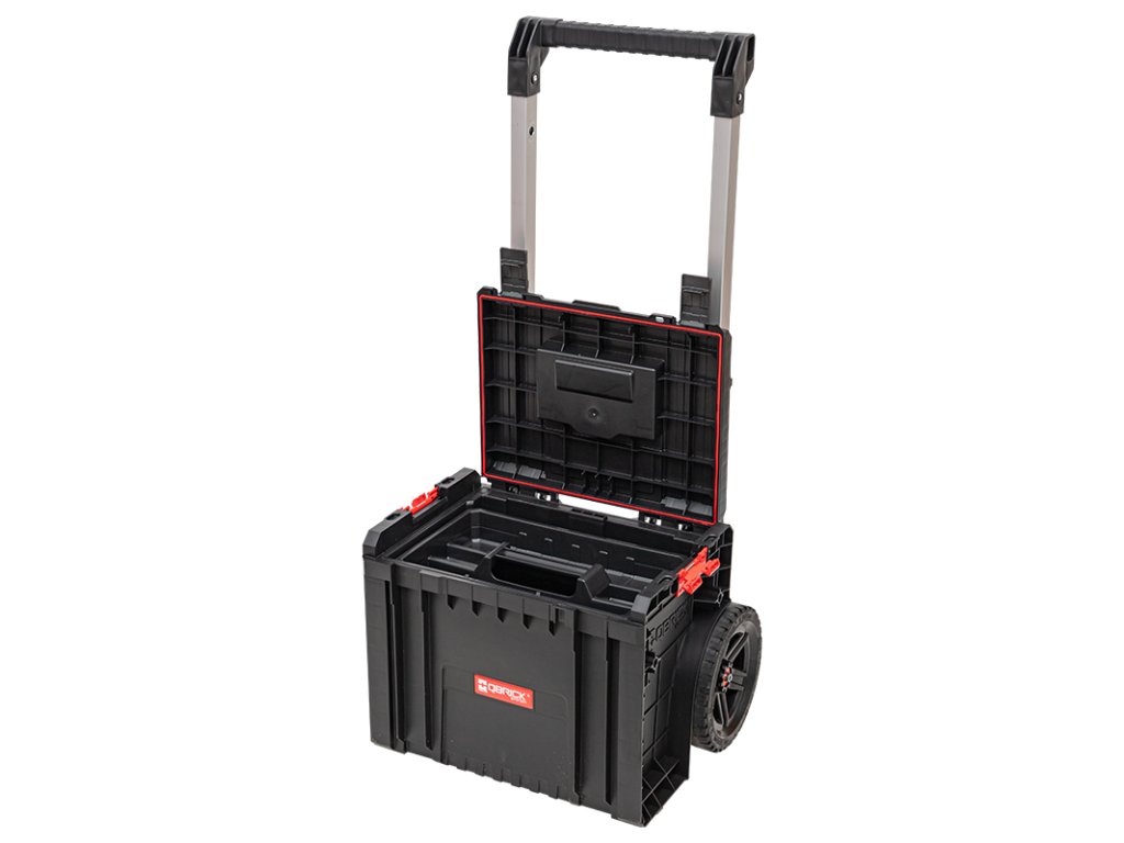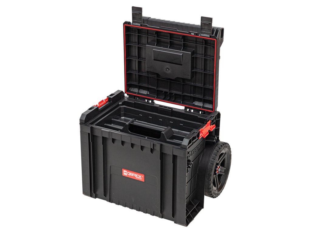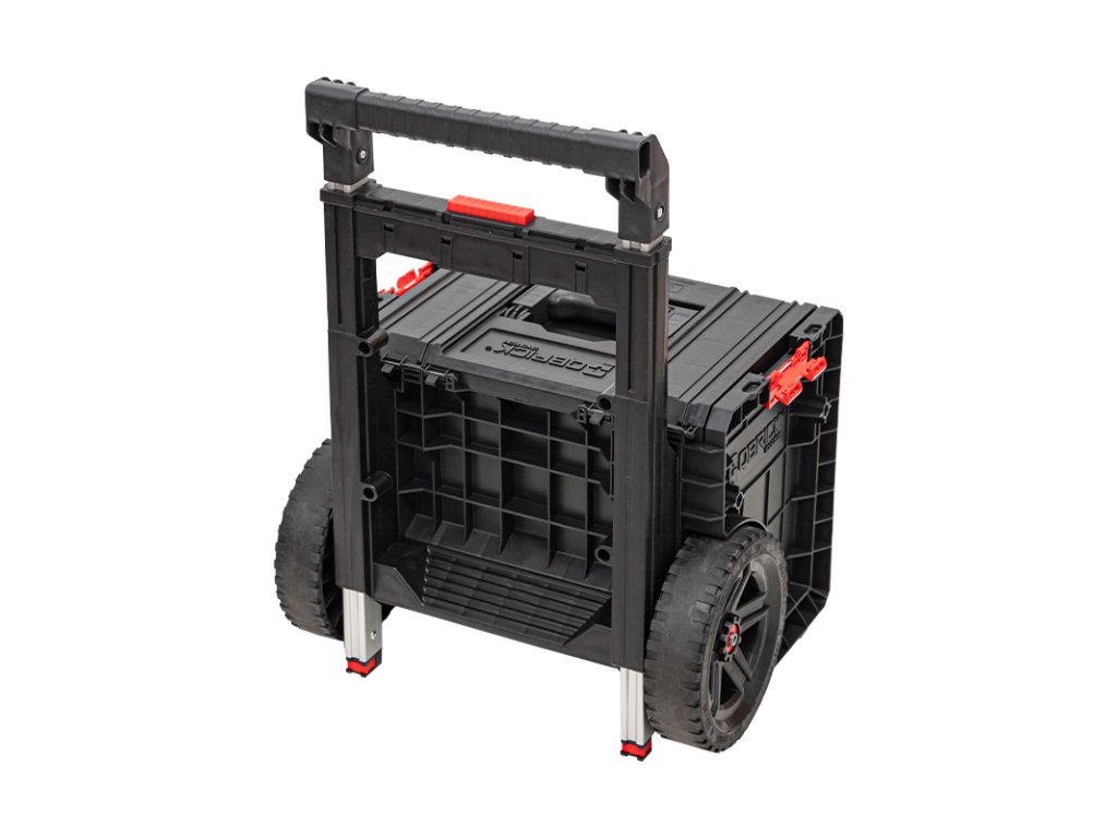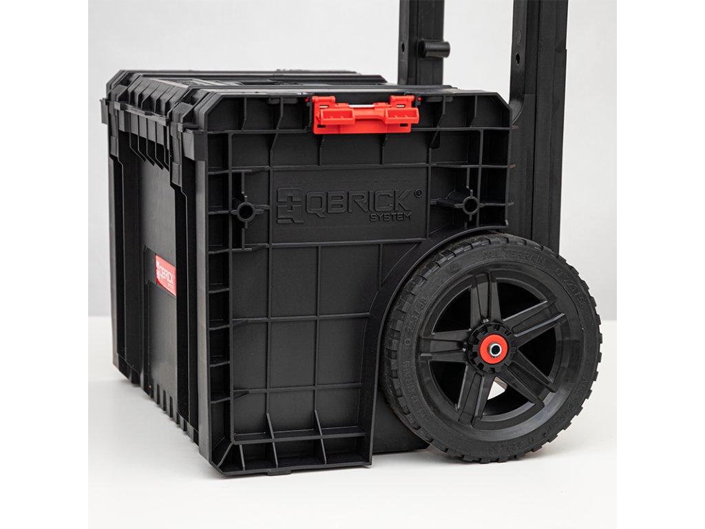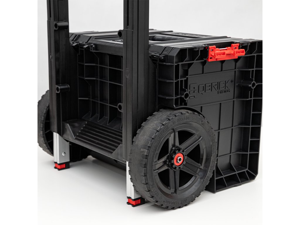 Qbrick System PRO Cart 2.0 Plus je mobilní box na kolečkách. Vybaven dvojitou, odnímatelnou teleskopickou rukojetí a pohodlnou platformou pro nohy umožňují pevné uchopení a snadné manévrování na relativně malé ploše. Velká 9palcová kola o šířce téměř 6 cm jsou pokryta silnou vrstvou gumy, která zajišťuje bezproblémovou trakci i v těch nejtěžších podmínkách.